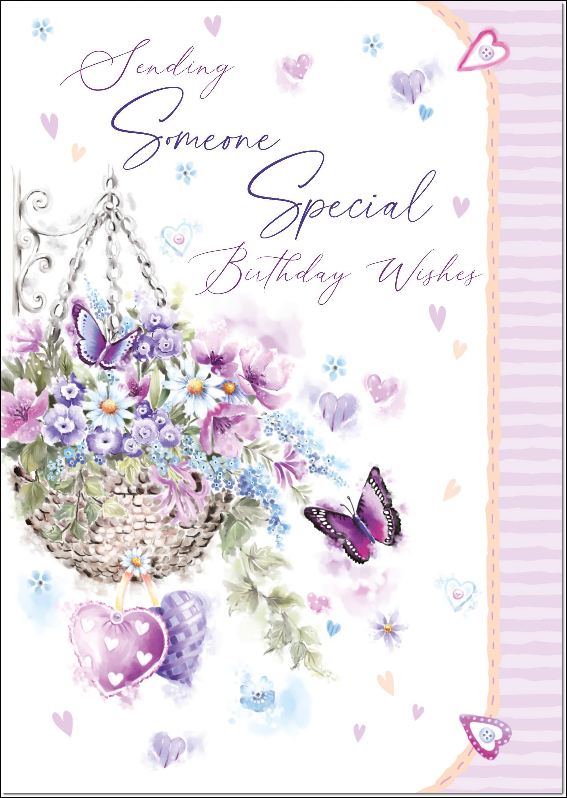Someone Special Birthday Card for Her Purple Hanging Basket