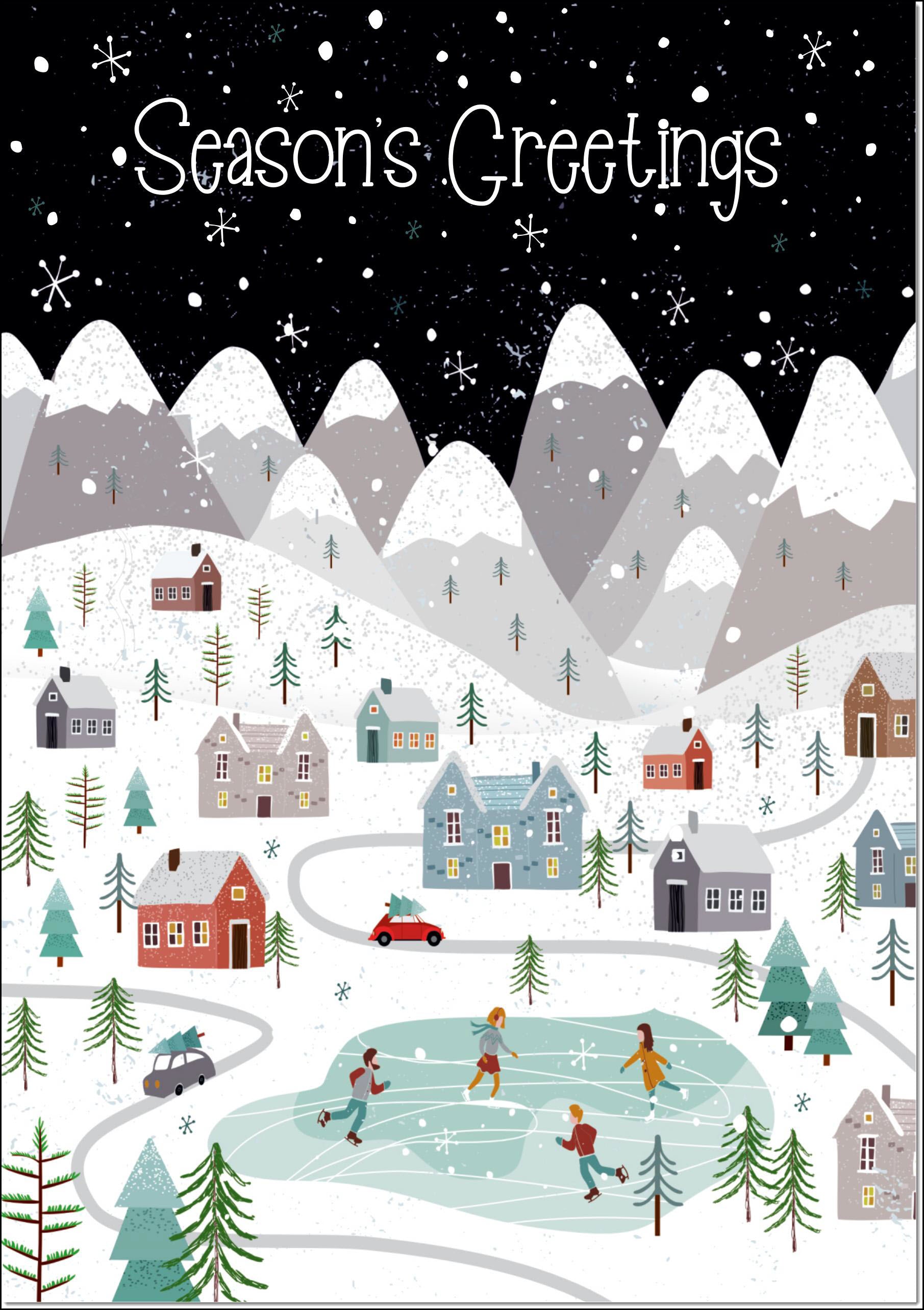Seasons Greetings Christmas Card Mountain Scene In Snowy Village