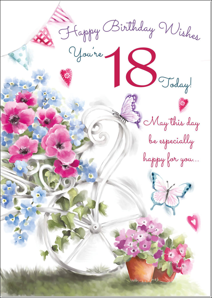 18th Birthday Card Age 18 for Her Garden Wheelbarrow Bouquet