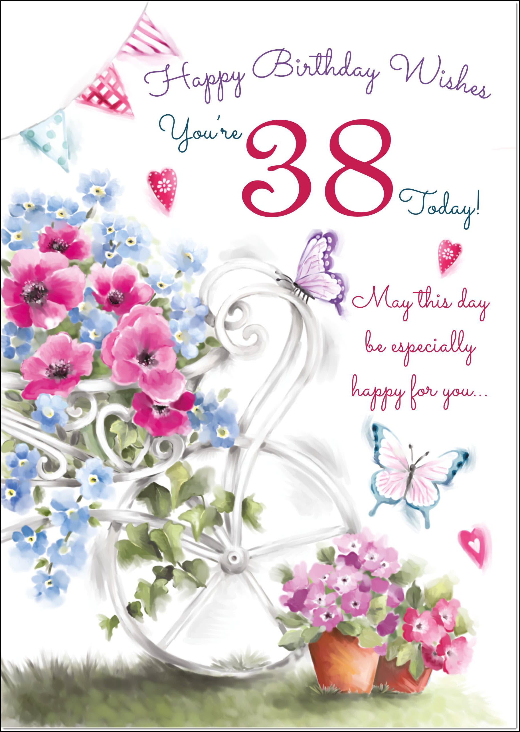 38th Birthday Card Age 38 for Her Garden Wheelbarrow Bouquet