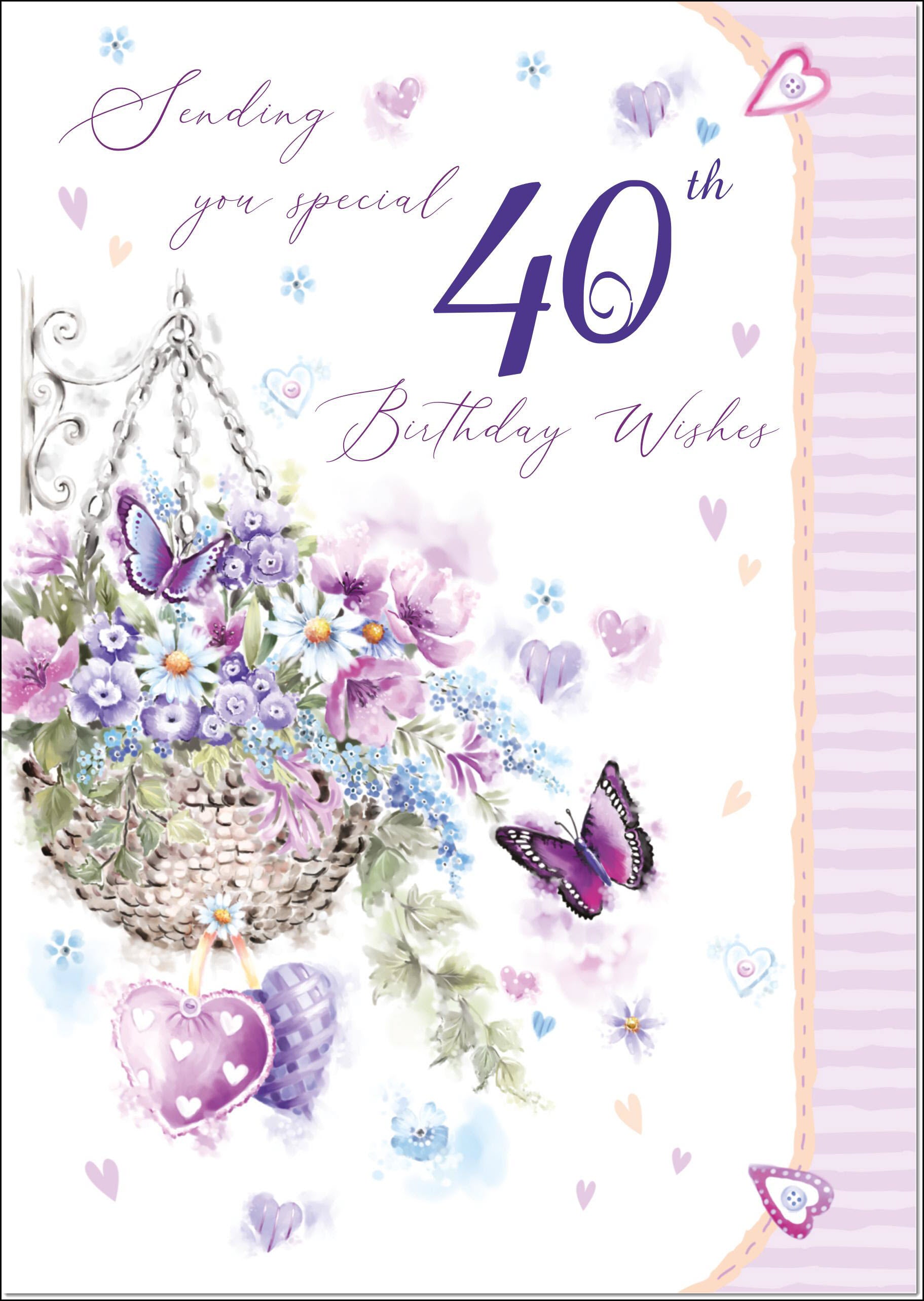40th Birthday Card Age 40 for Her Purple Hanging Basket