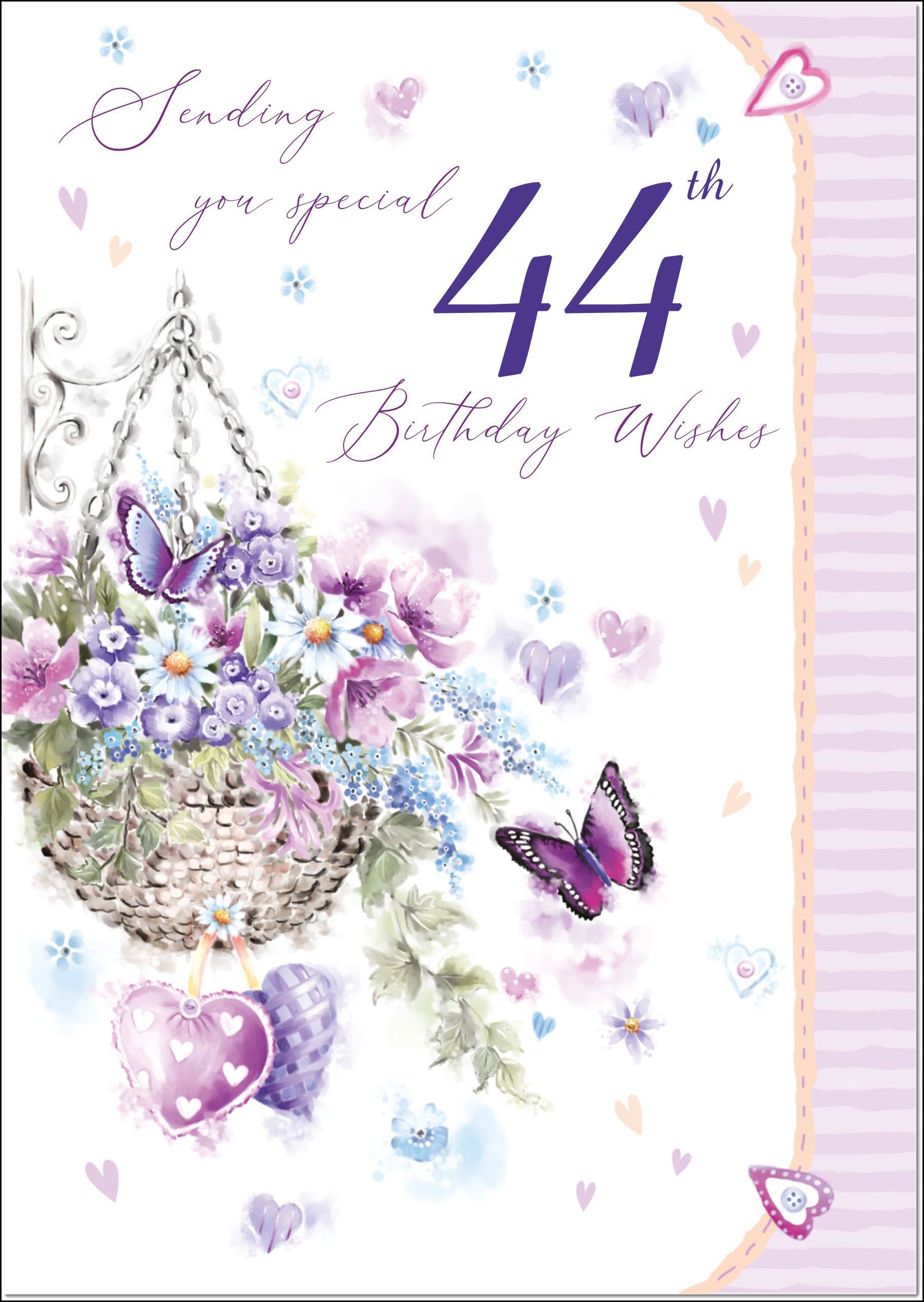 44th Birthday Card Age 44 for Her Purple Hanging Basket