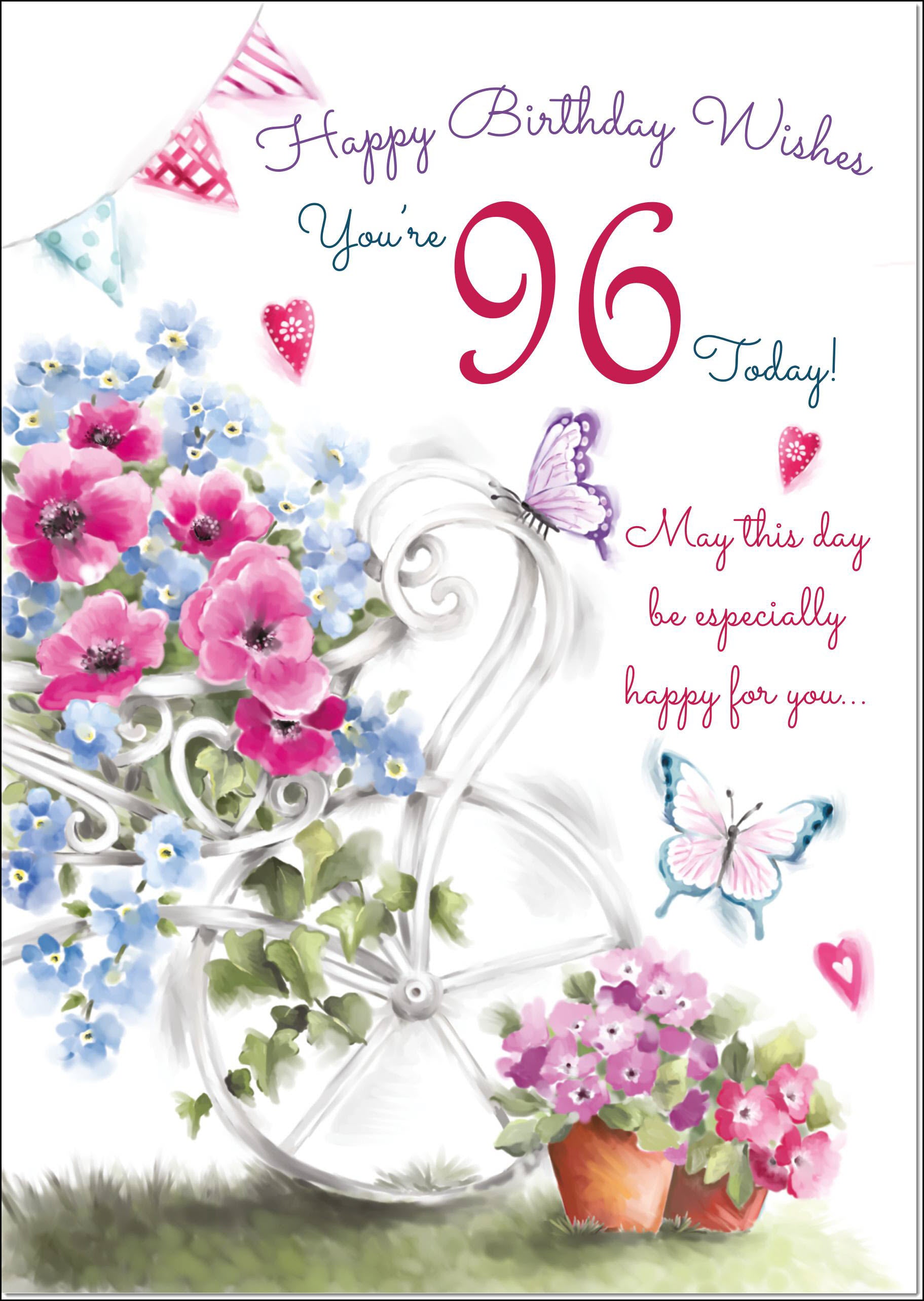 96th Birthday Card Age 96 for Her Garden Wheelbarrow Bouquet