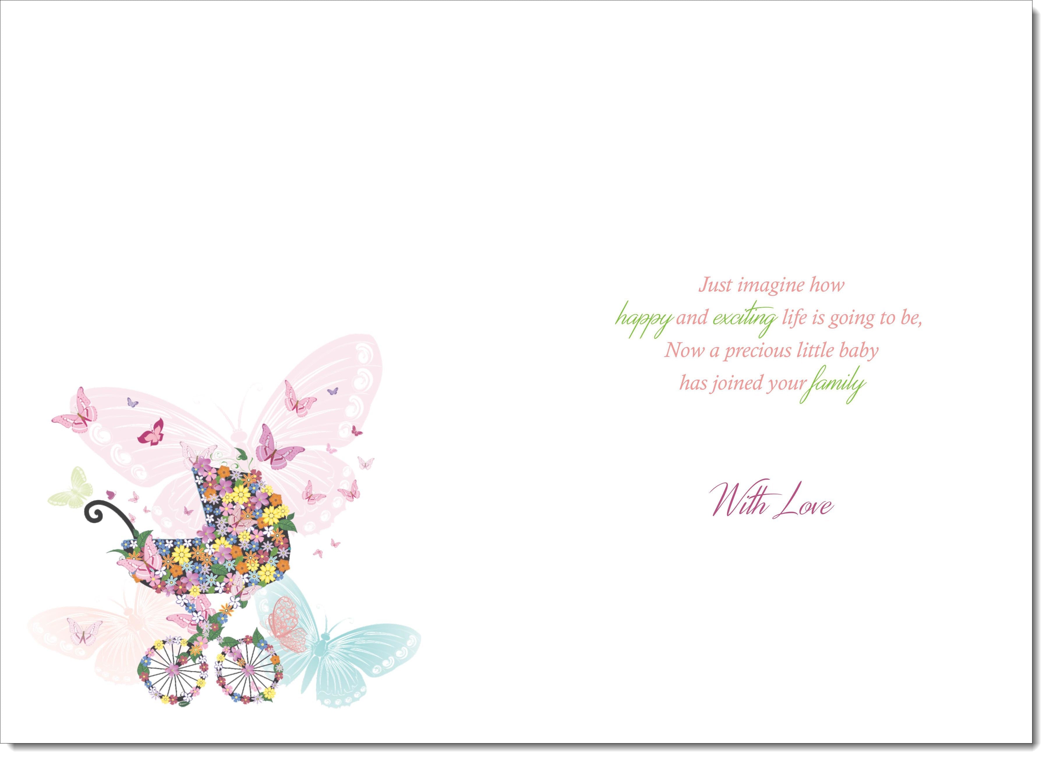 New Baby Girl Birth Congratulations Card Butterfly Pram