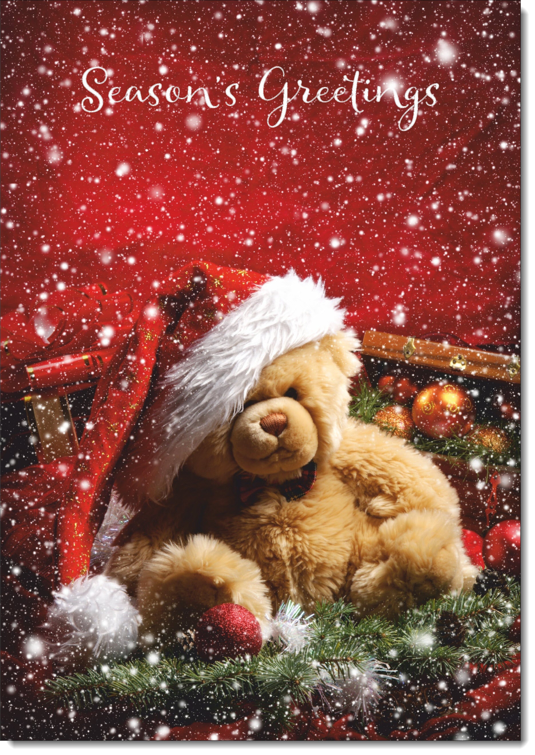Seasons Greetings Christmas Card Teddy Bear in Santa Hat