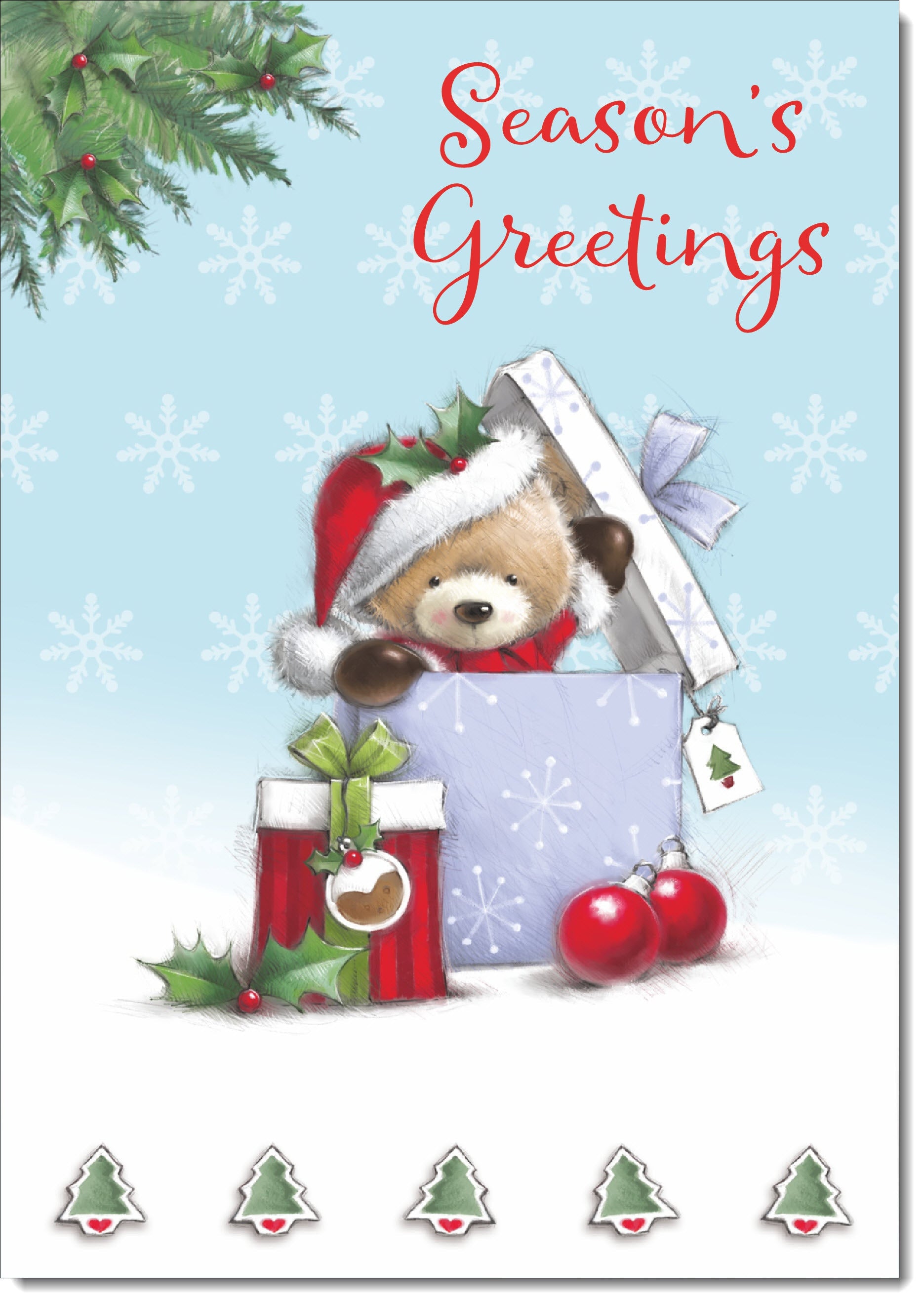 Seasons Greetings Christmas Card Cute Bear in Christmas Parcel
