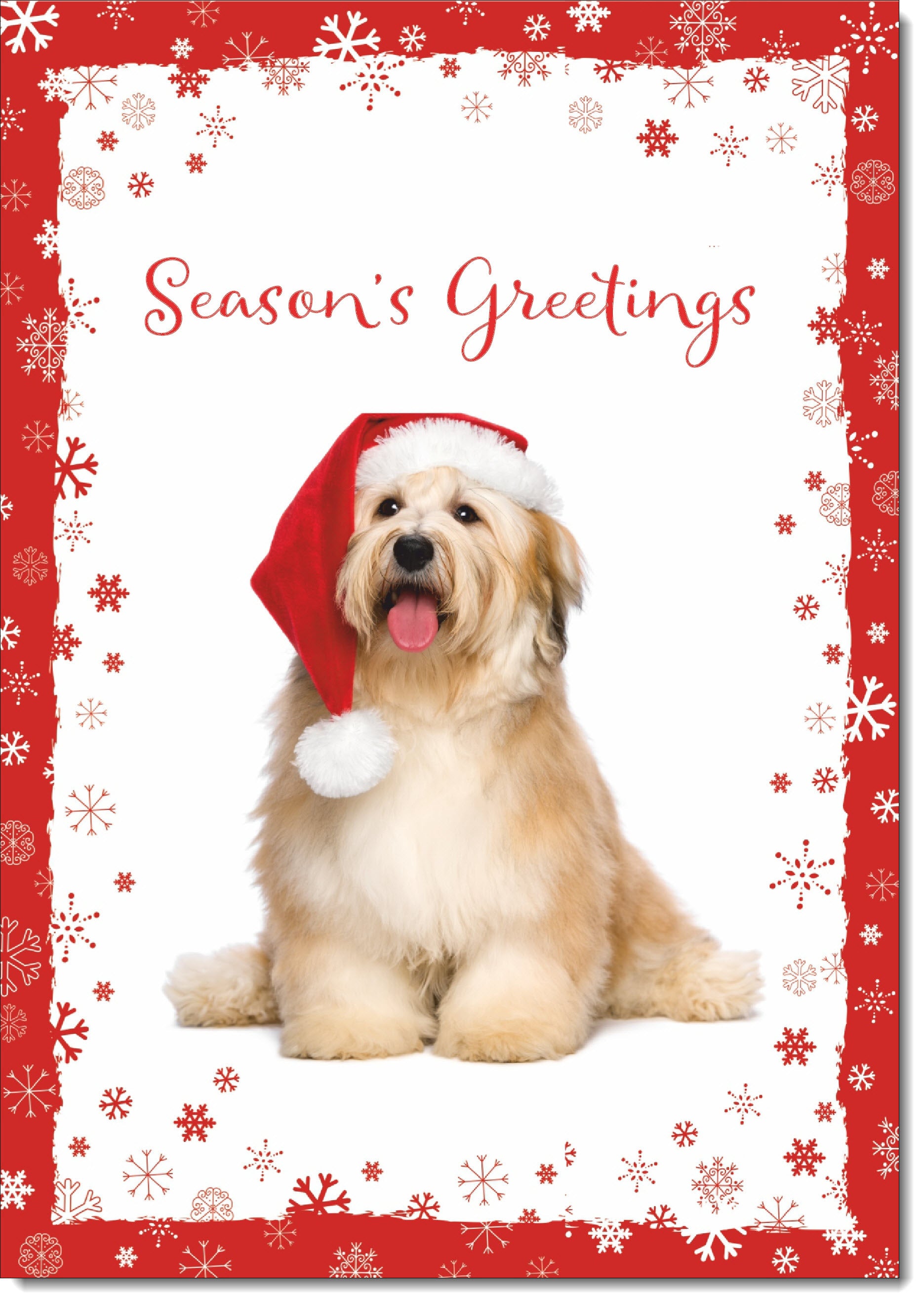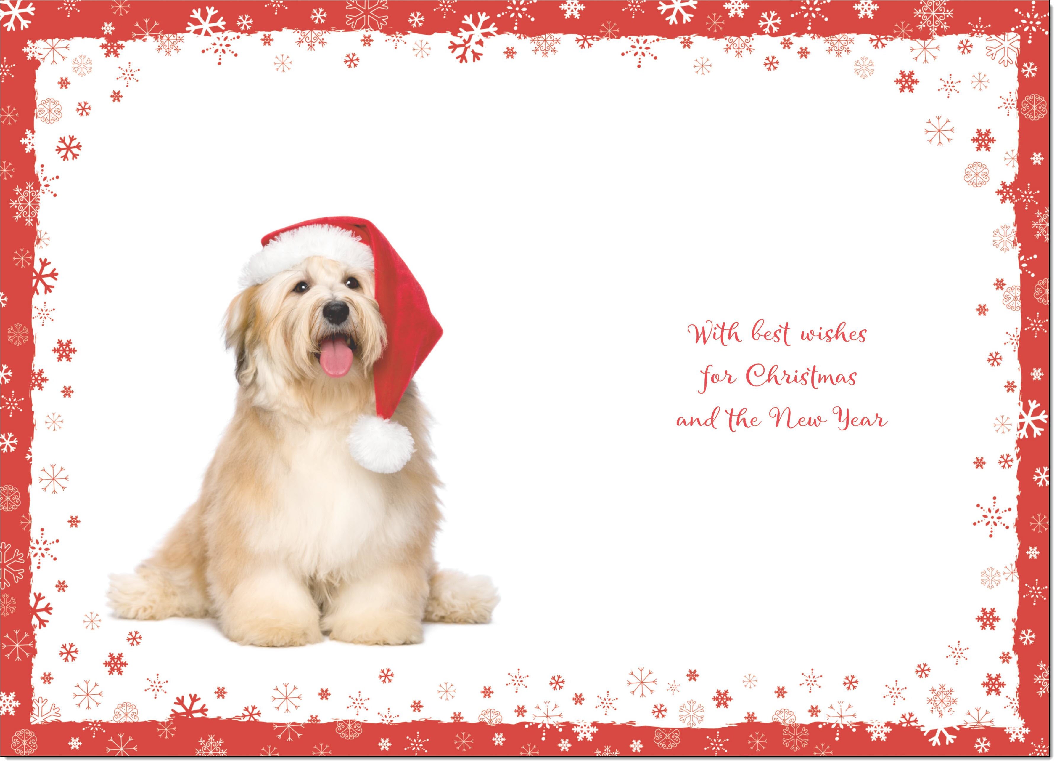 Seasons Greetings Christmas Card Fluffy Dog in Santa Hat