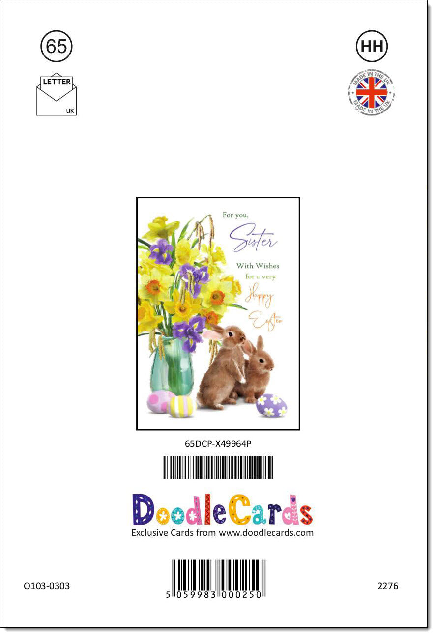 Sister Easter Card Vase of Daffodils with Bunnies and Eggs