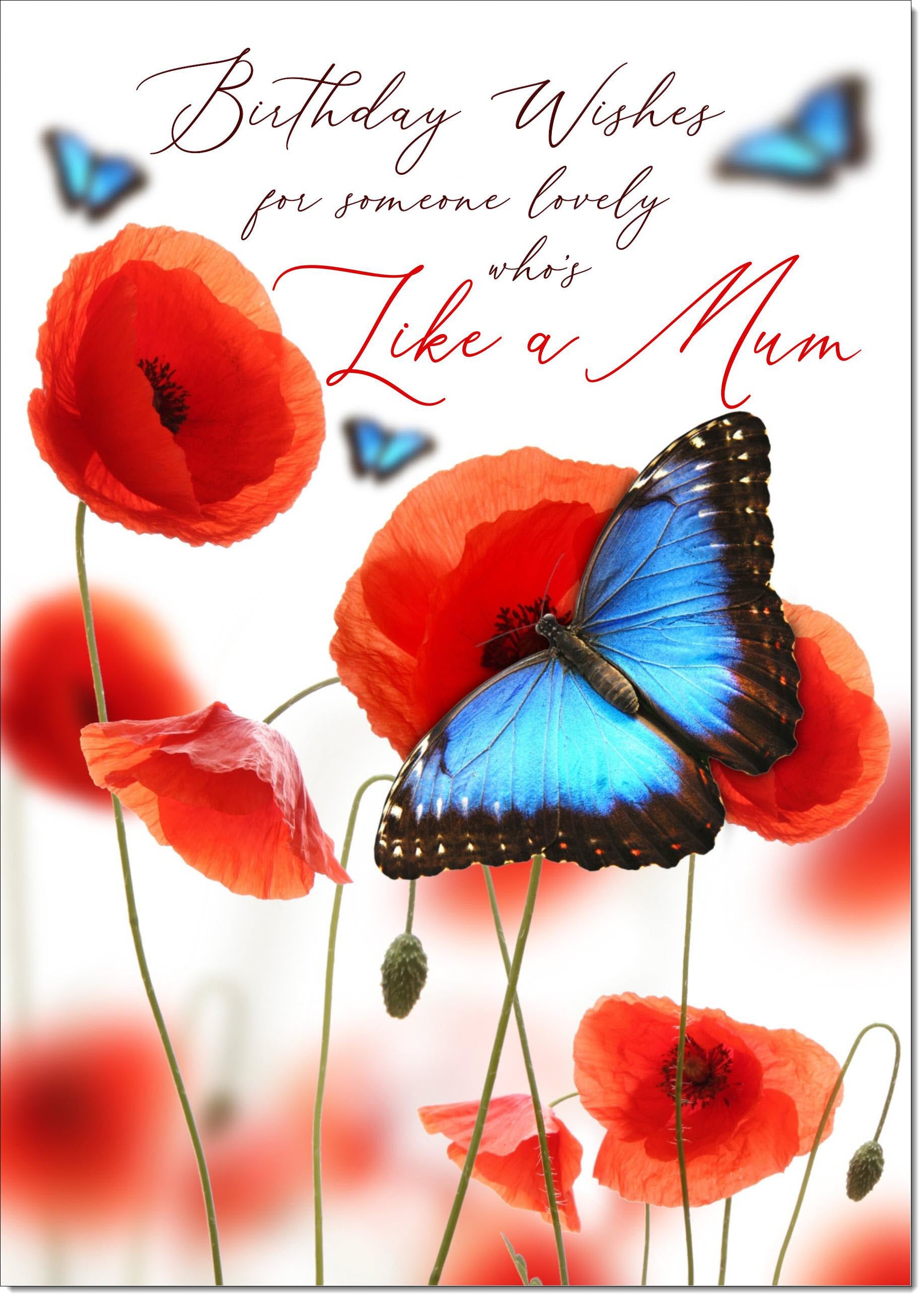 Like a Mum Birthday Card Poppies and Blue Butterflies