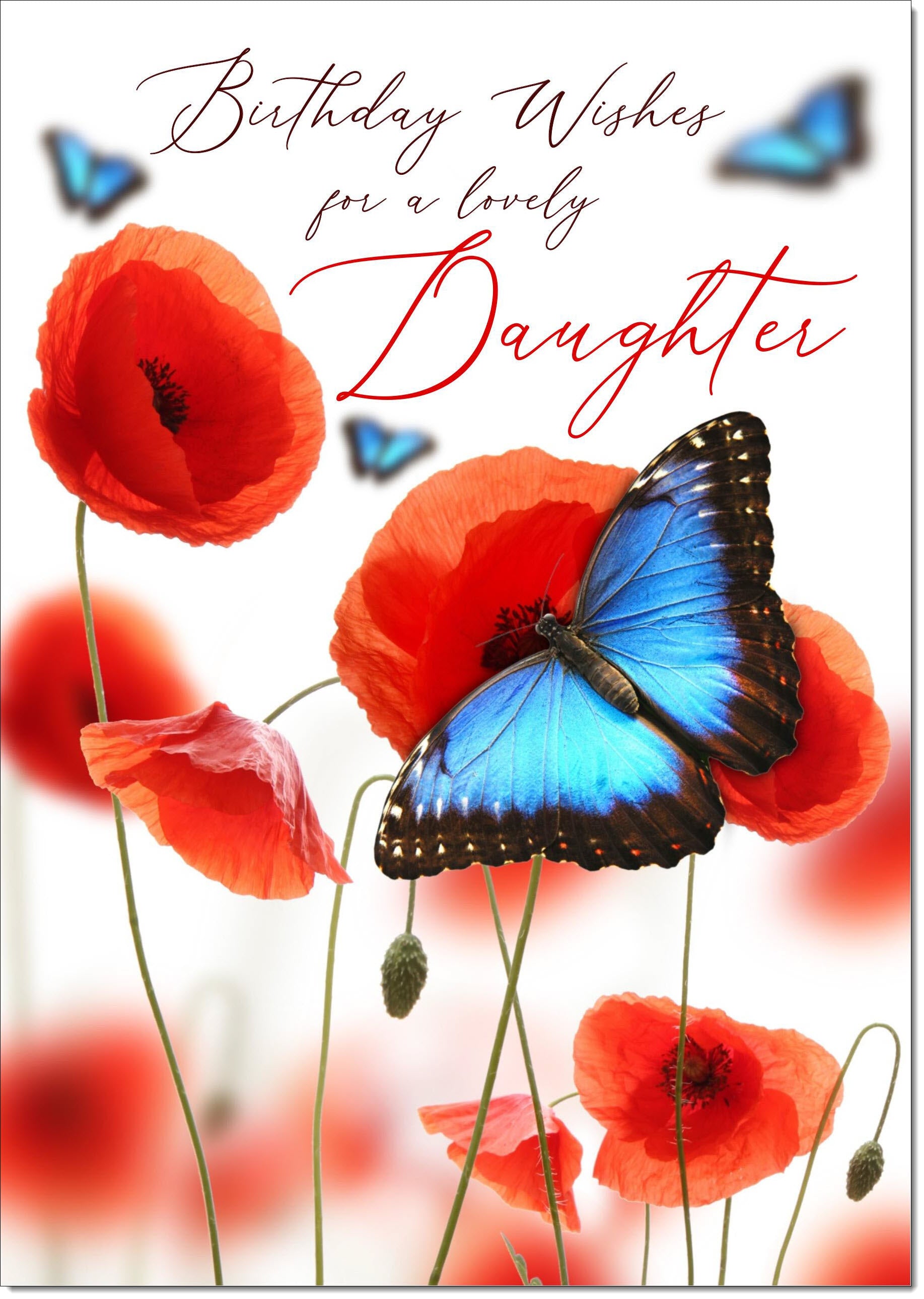 This Daughter Birthday Card features a beautifully crafted design with vibrant poppies and delicate blue butterflies, printed on premium quality materials to ensure a memorable and heartfelt message. It is available in two convenient sizes to suit your mailing needs.