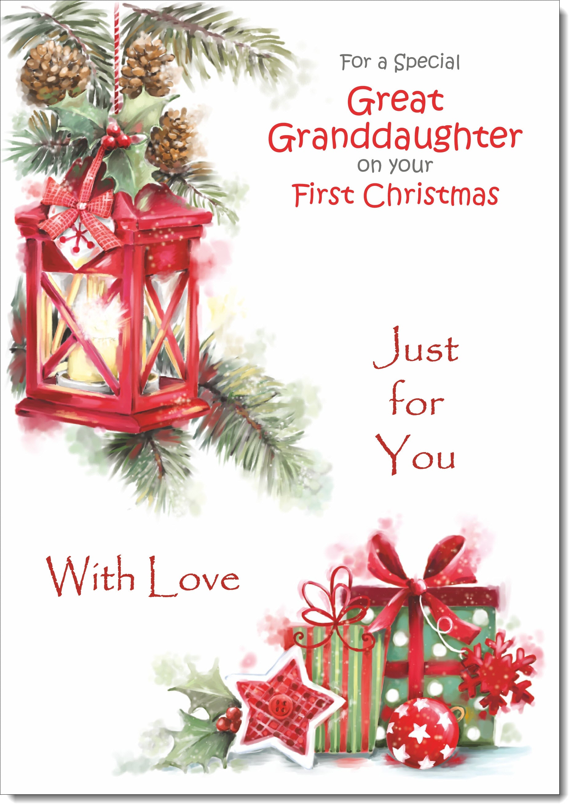 Great Granddaughters 1st Christmas Card Red Lantern & Christmas Presents