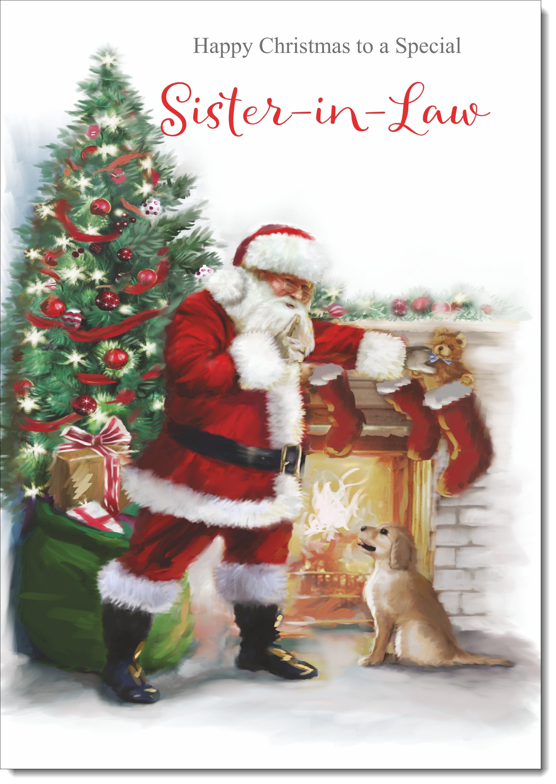 Sister-in-Law Christmas Card Santa by Christmas Tree