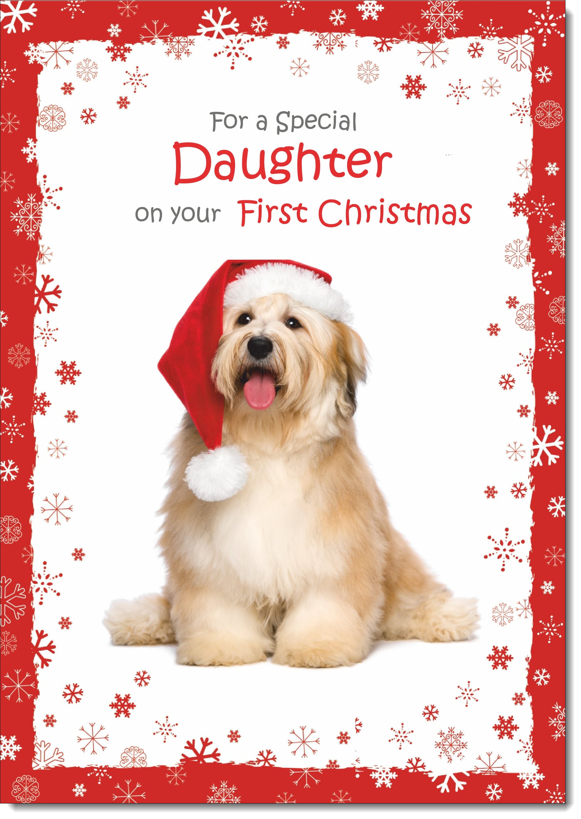 Daughter 1st Christmas Card Fluffy Dog in Santa Hat