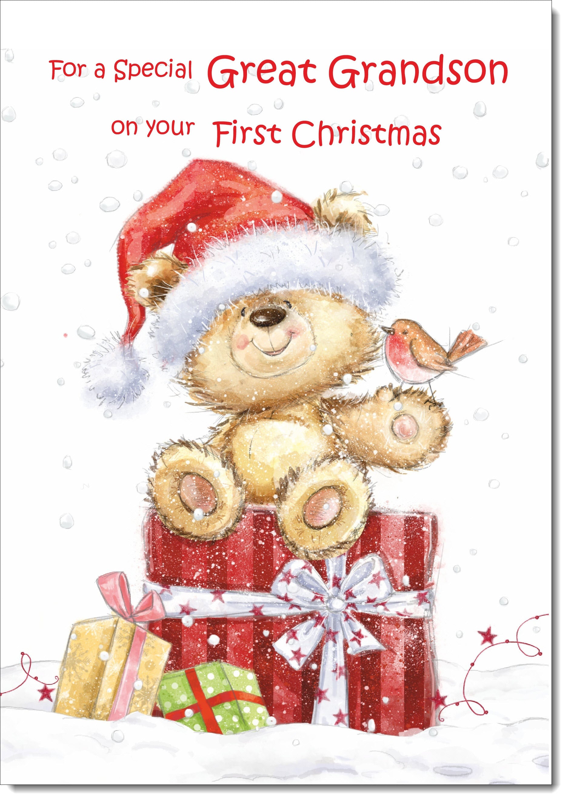 Great Grandsons 1st Christmas Card Cute Bear on Parcel