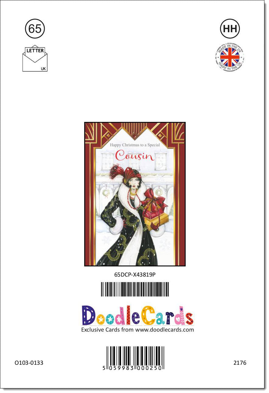 Cousin Christmas Card Art Deco Lady with Christmas Gift