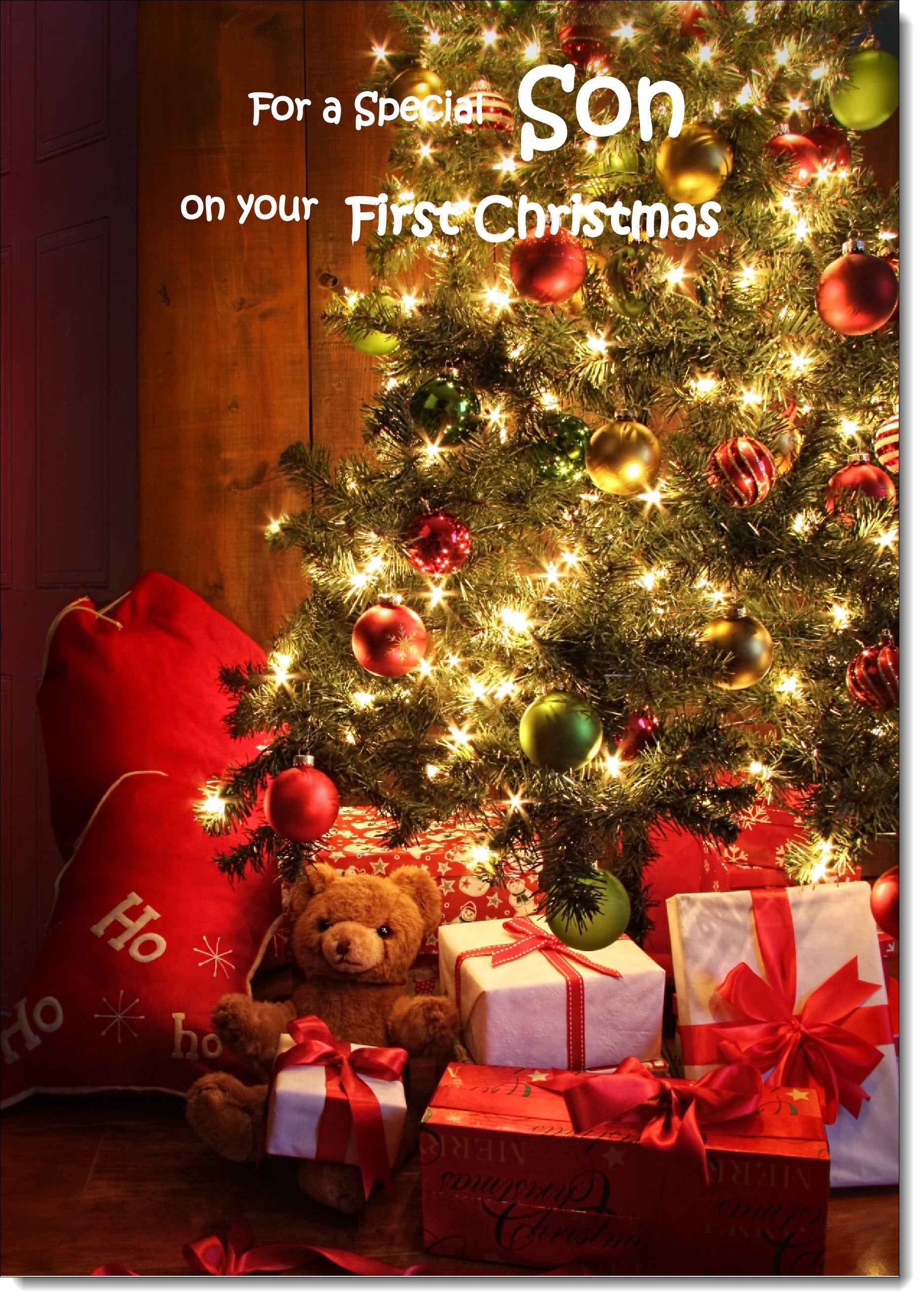 Sons 1st Christmas Card Teddy by Christmas Tree