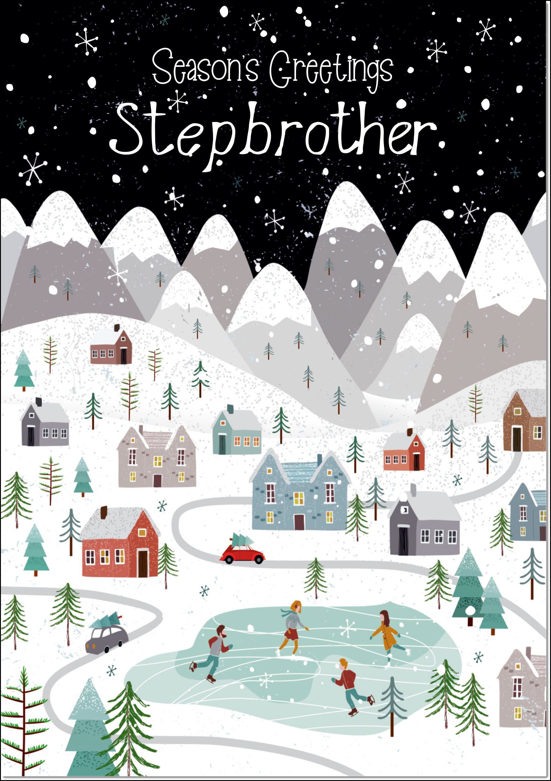 Stepbrother Christmas Card Mountain Scene In Snowy Village