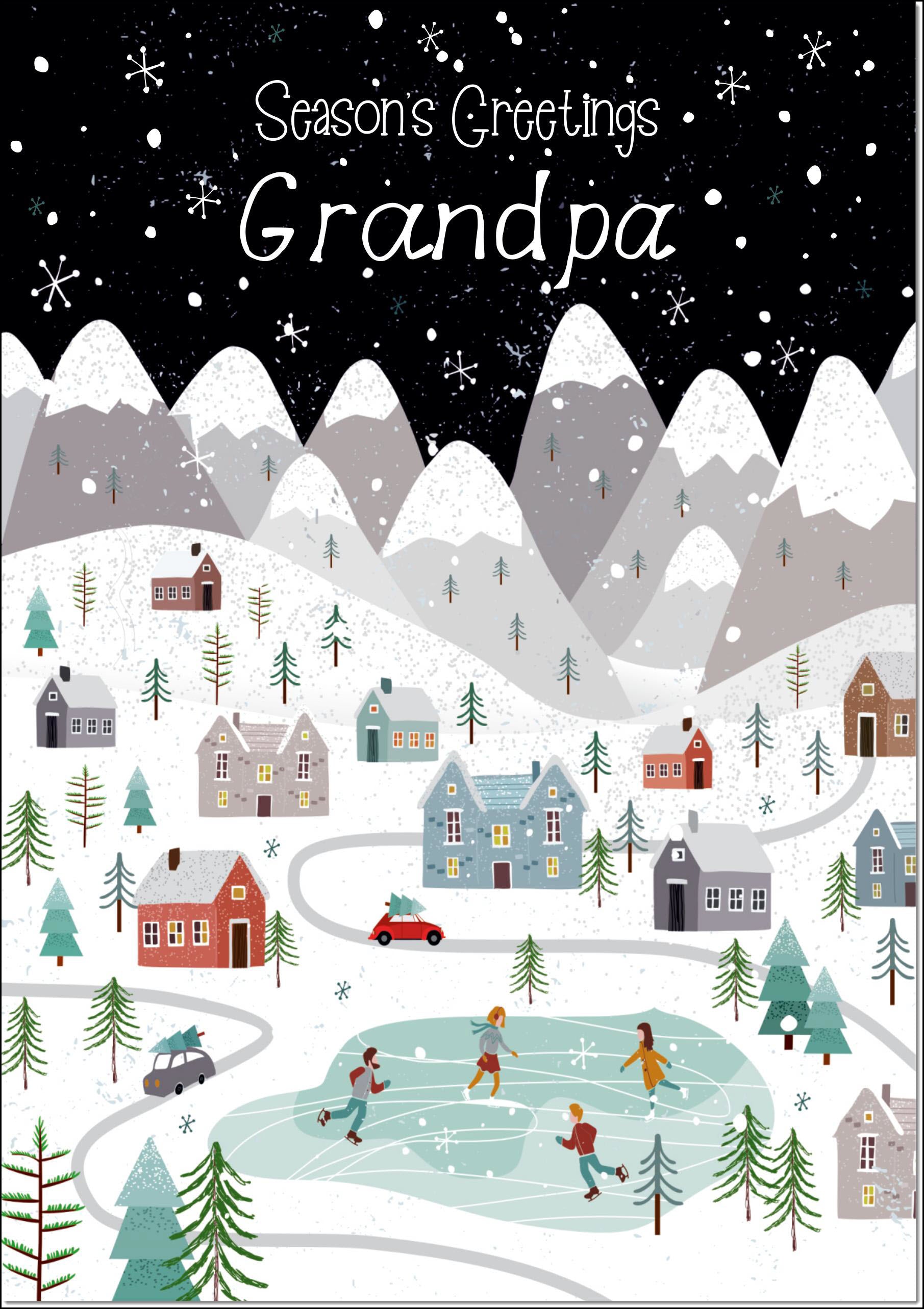 Grandpa Christmas Card Mountain Scene In Snowy Village