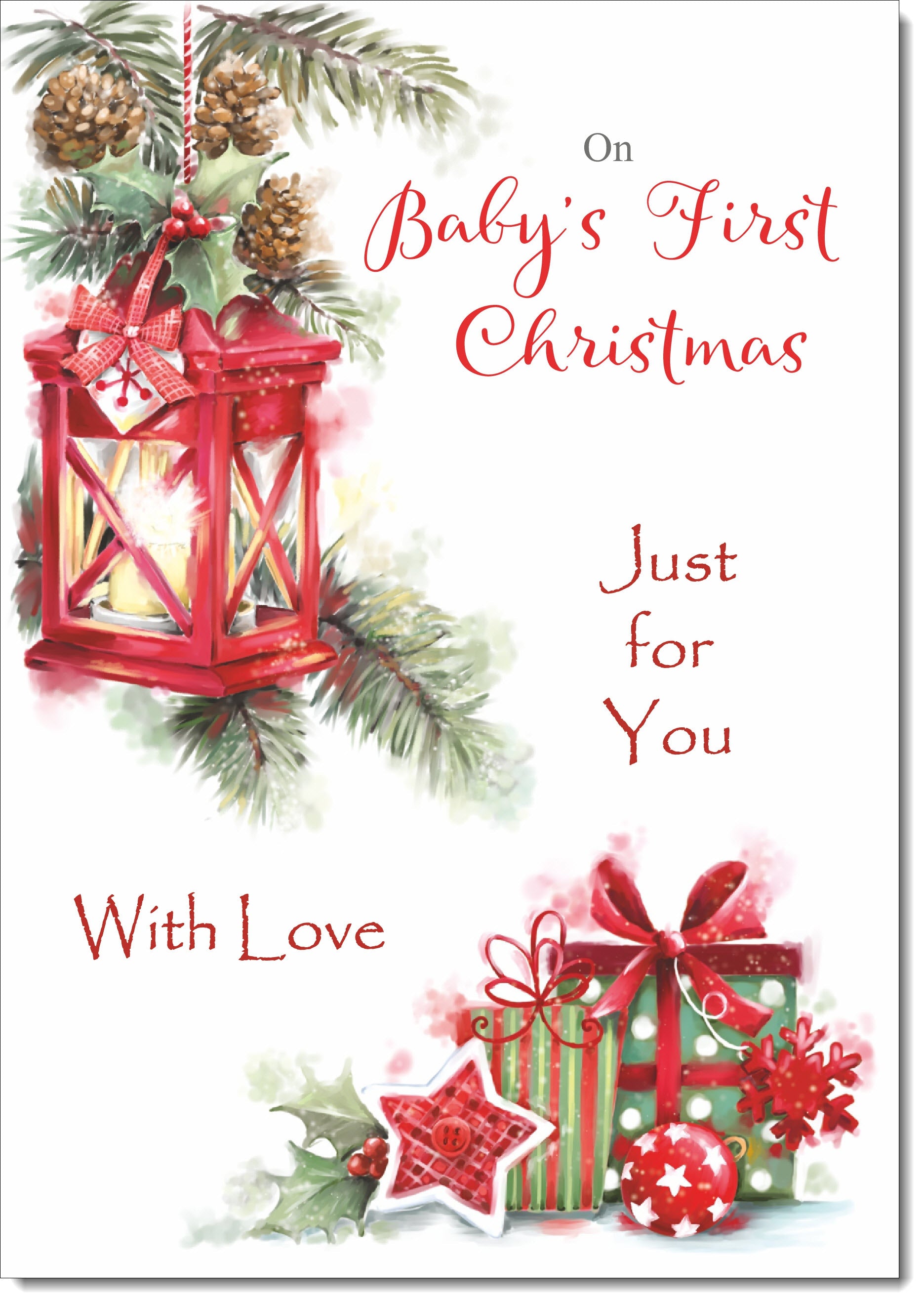 Babys 1st Christmas Card Red Lantern & Christmas Presents
