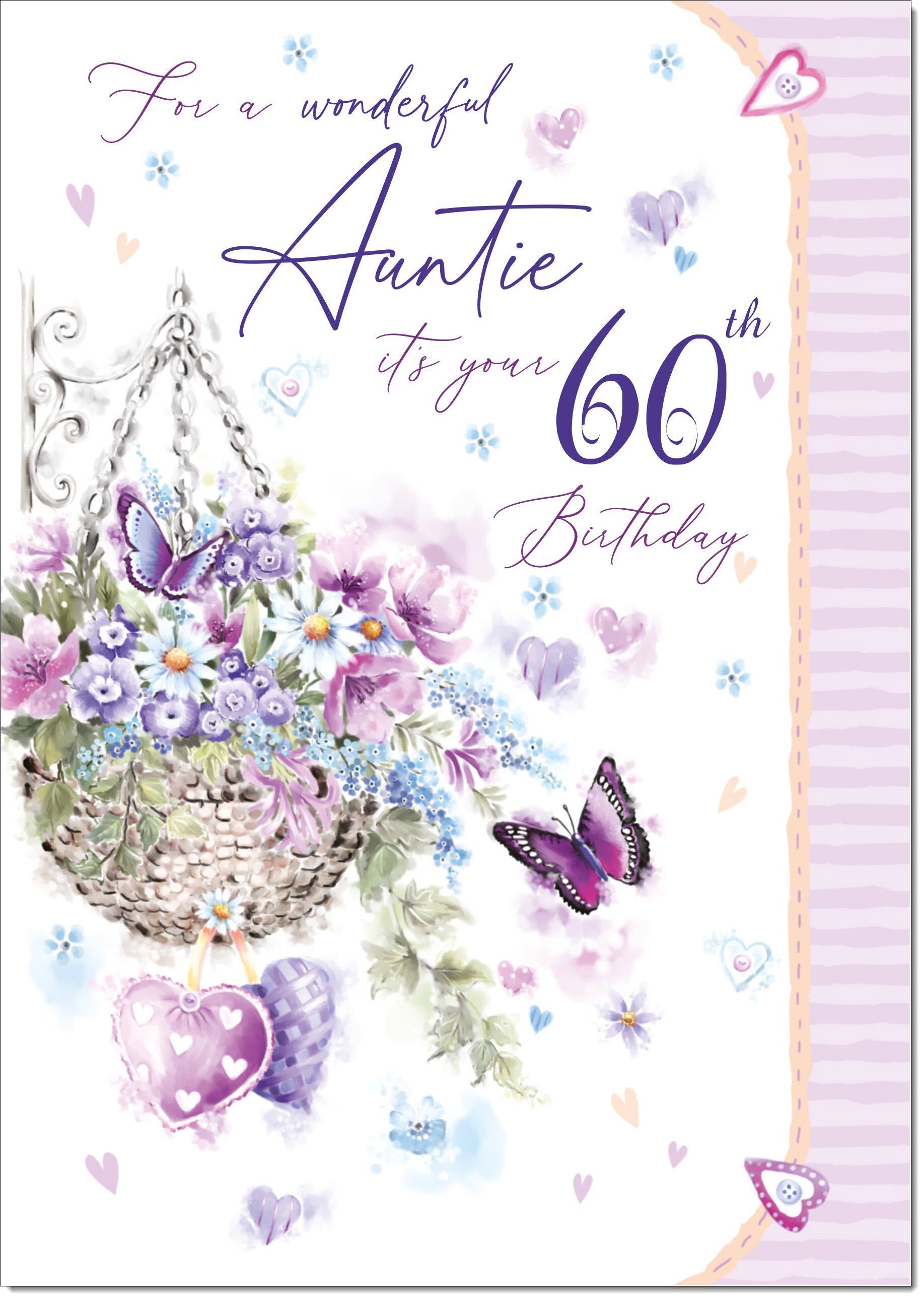 Auntie 60th Birthday Card Age 60 Purple Hanging Basket