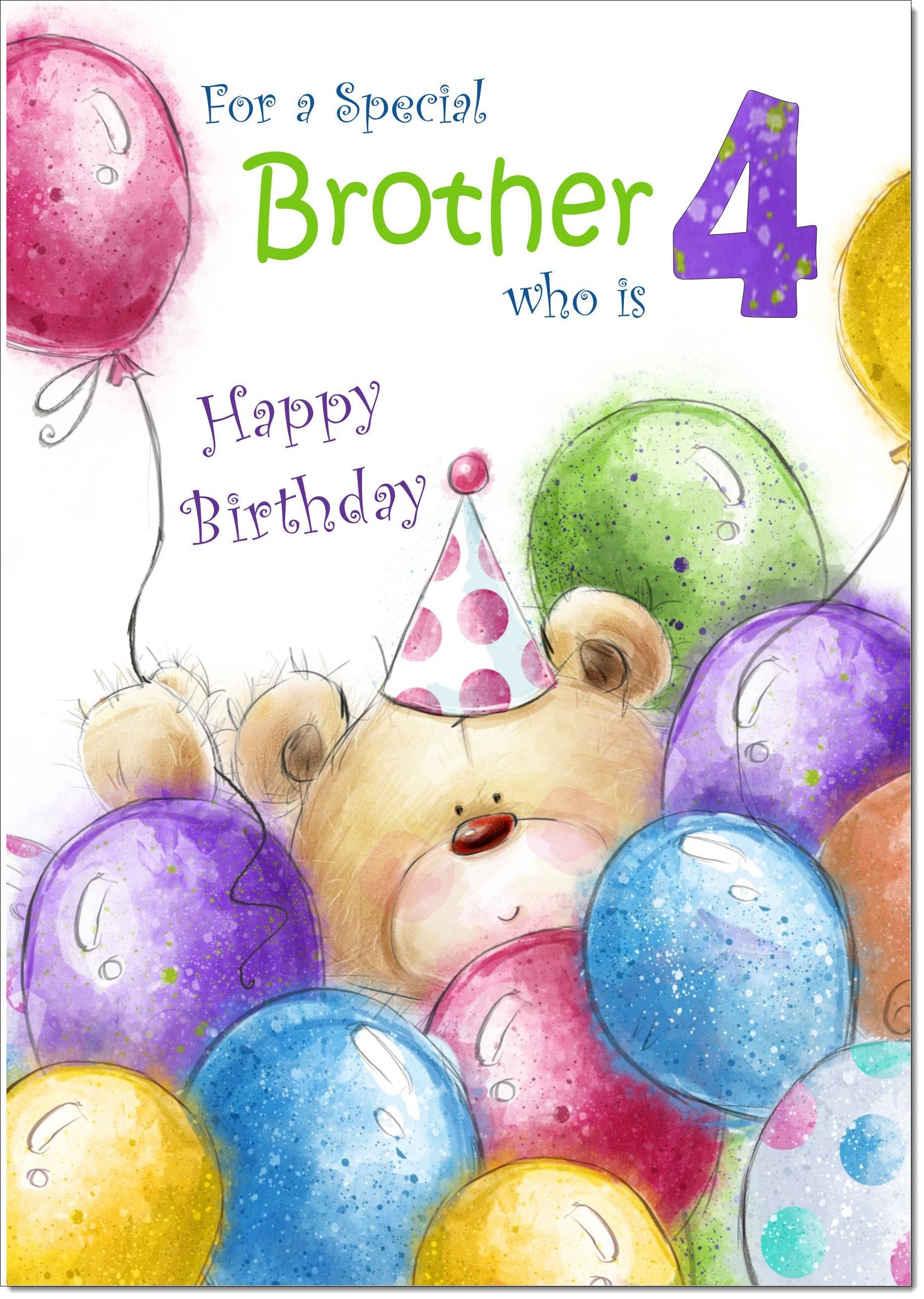 Brother 4th Birthday Card Age 4 Cute Teddy Bear in Balloons