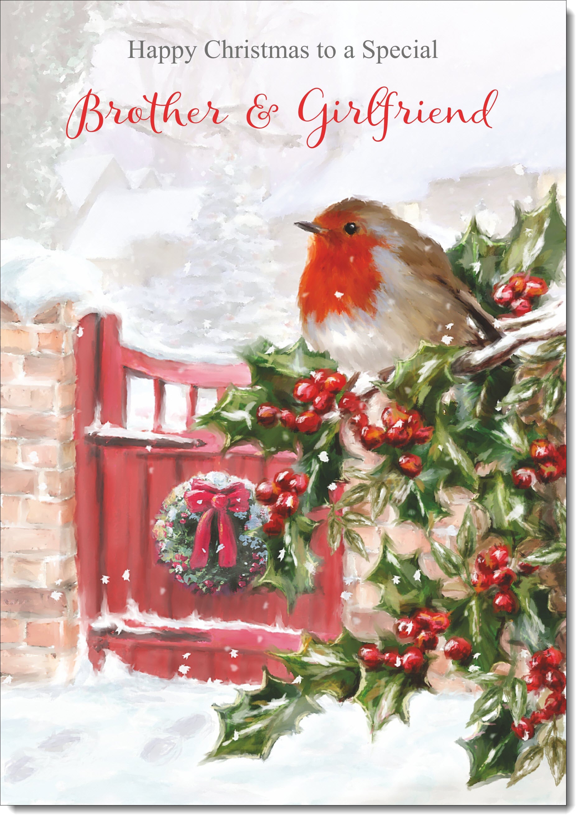 Brother & Girlfriend Christmas Card Robin on Holly Tree