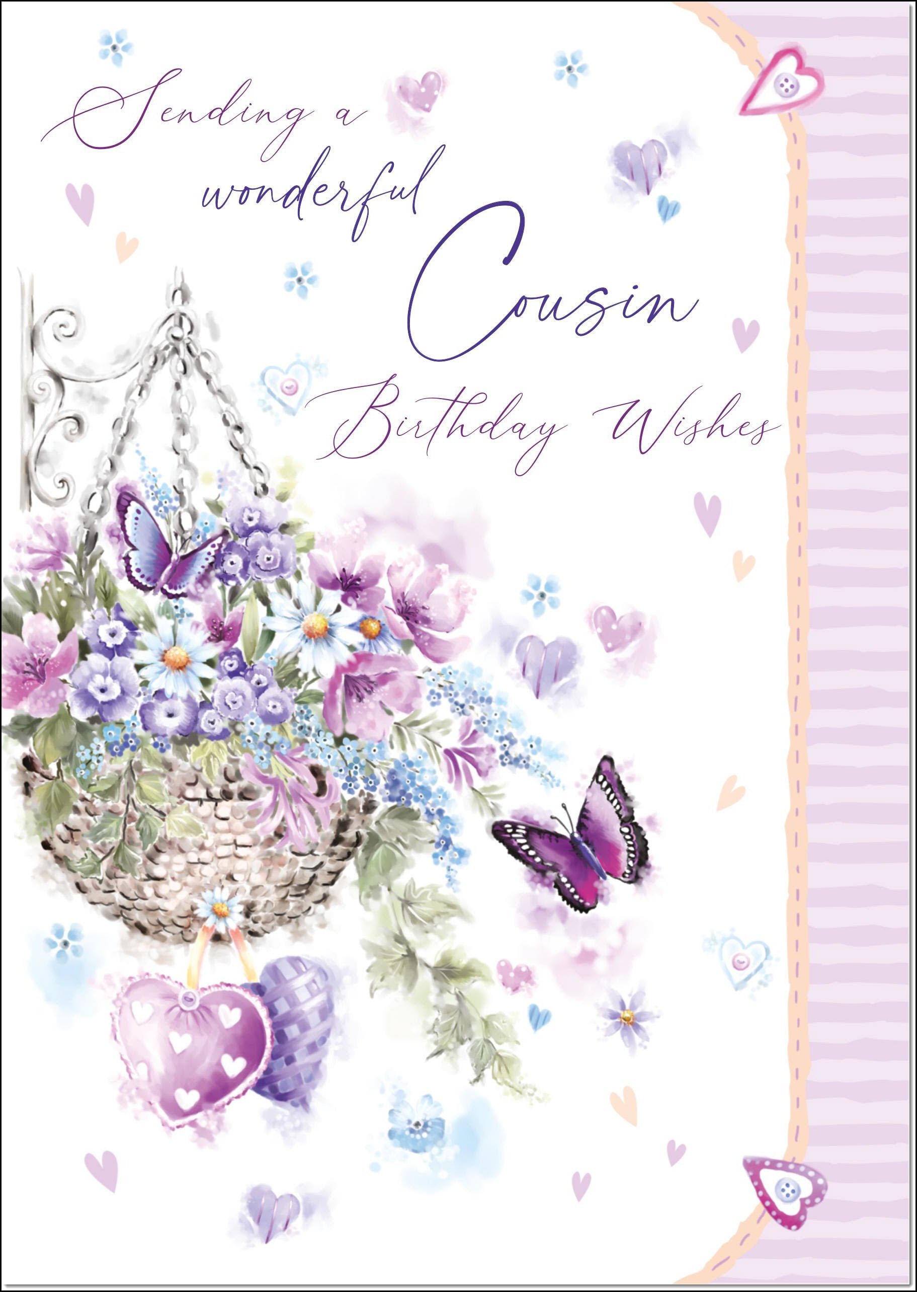 Cousin Birthday Card for Her Purple Hanging Basket