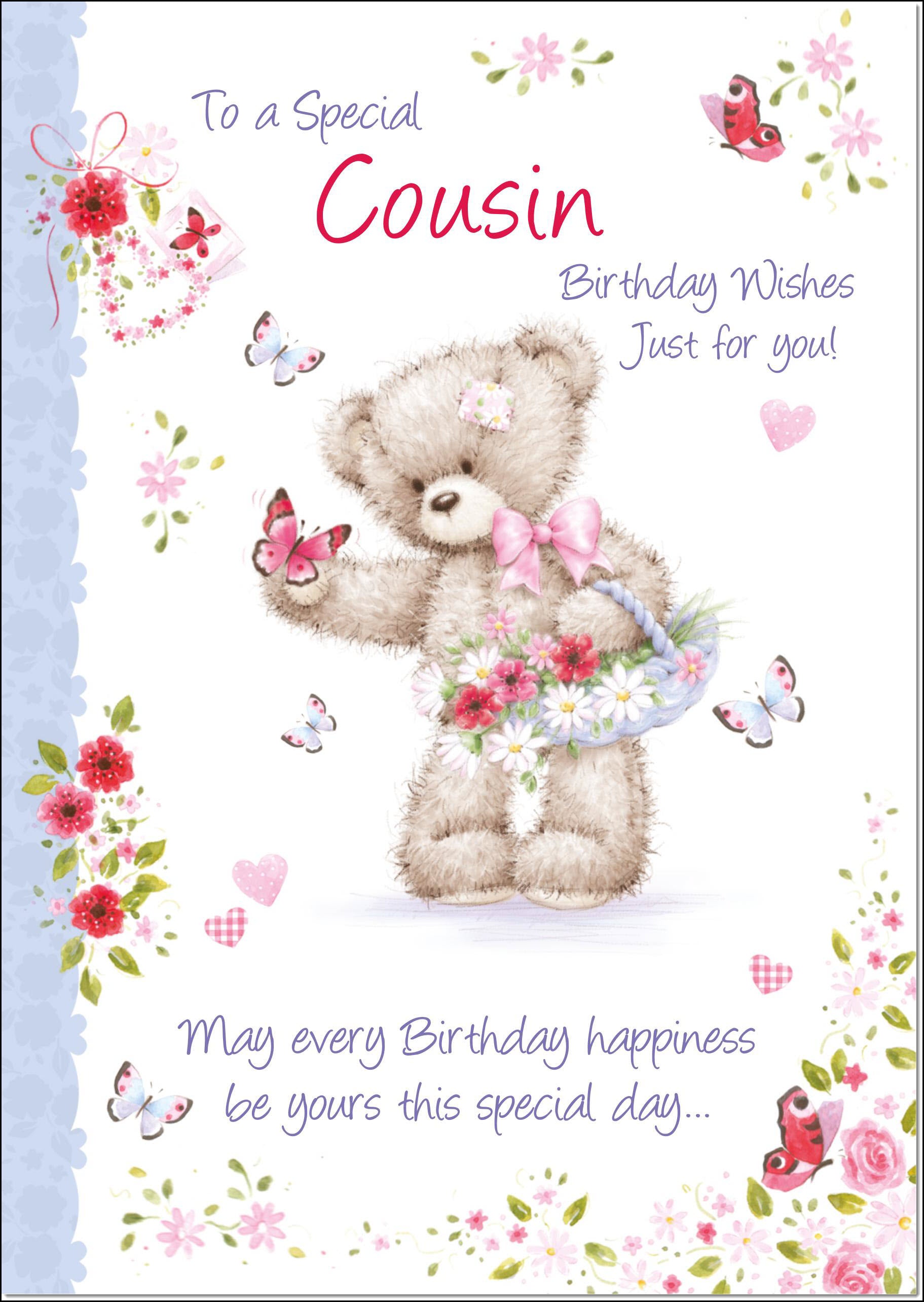 Cousin Birthday Card for Her Cute Teddy's Flowers and Butterflies