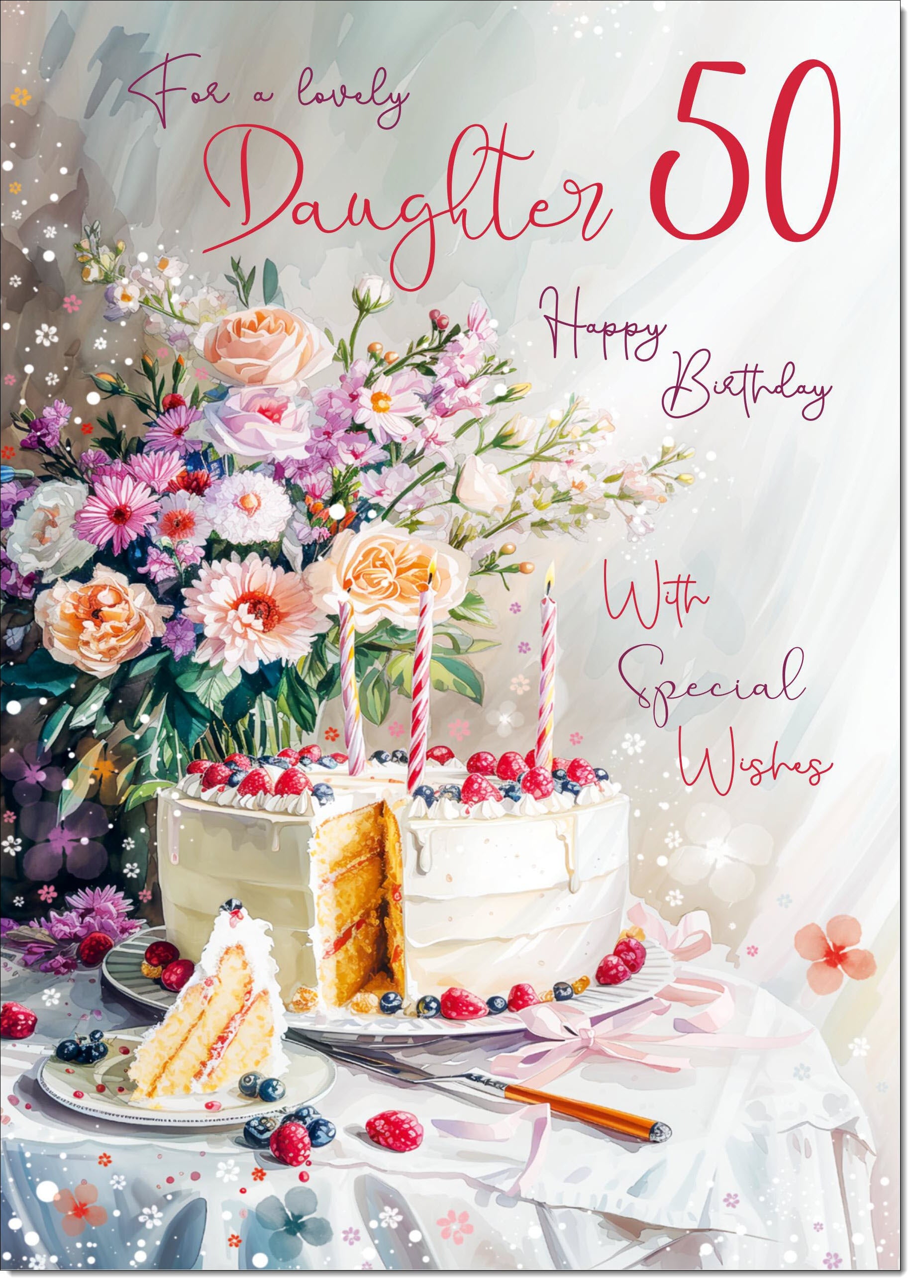 Daughter 50th Birthday Card Age 50 Birthday Cake and Flowers