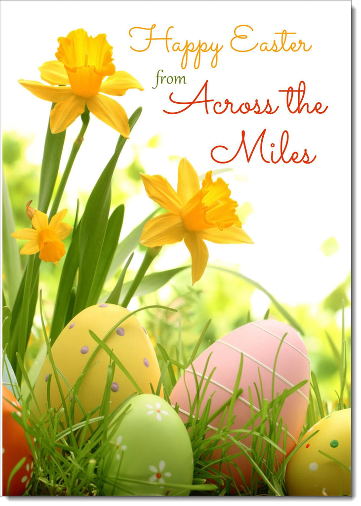Across The Miles Easter Card Vase of Daffodils with Bunnies and Eggs