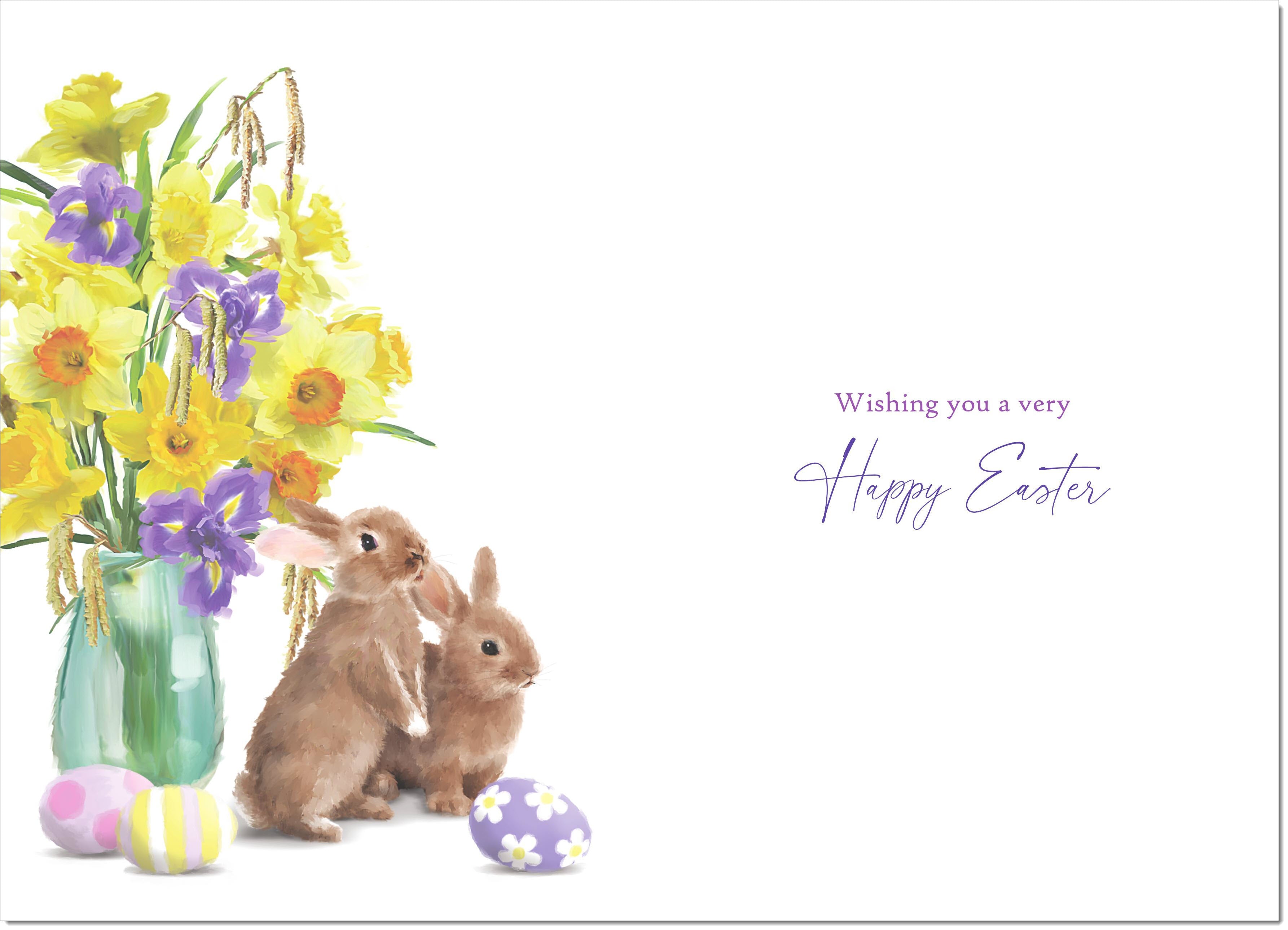 Godson Easter Card Vase of Daffodils with Bunnies and Eggs