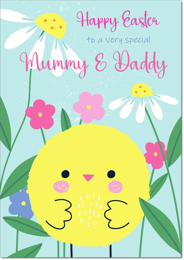 Mummy & Daddy Easter Card Yellow Chick and Spring Flowers