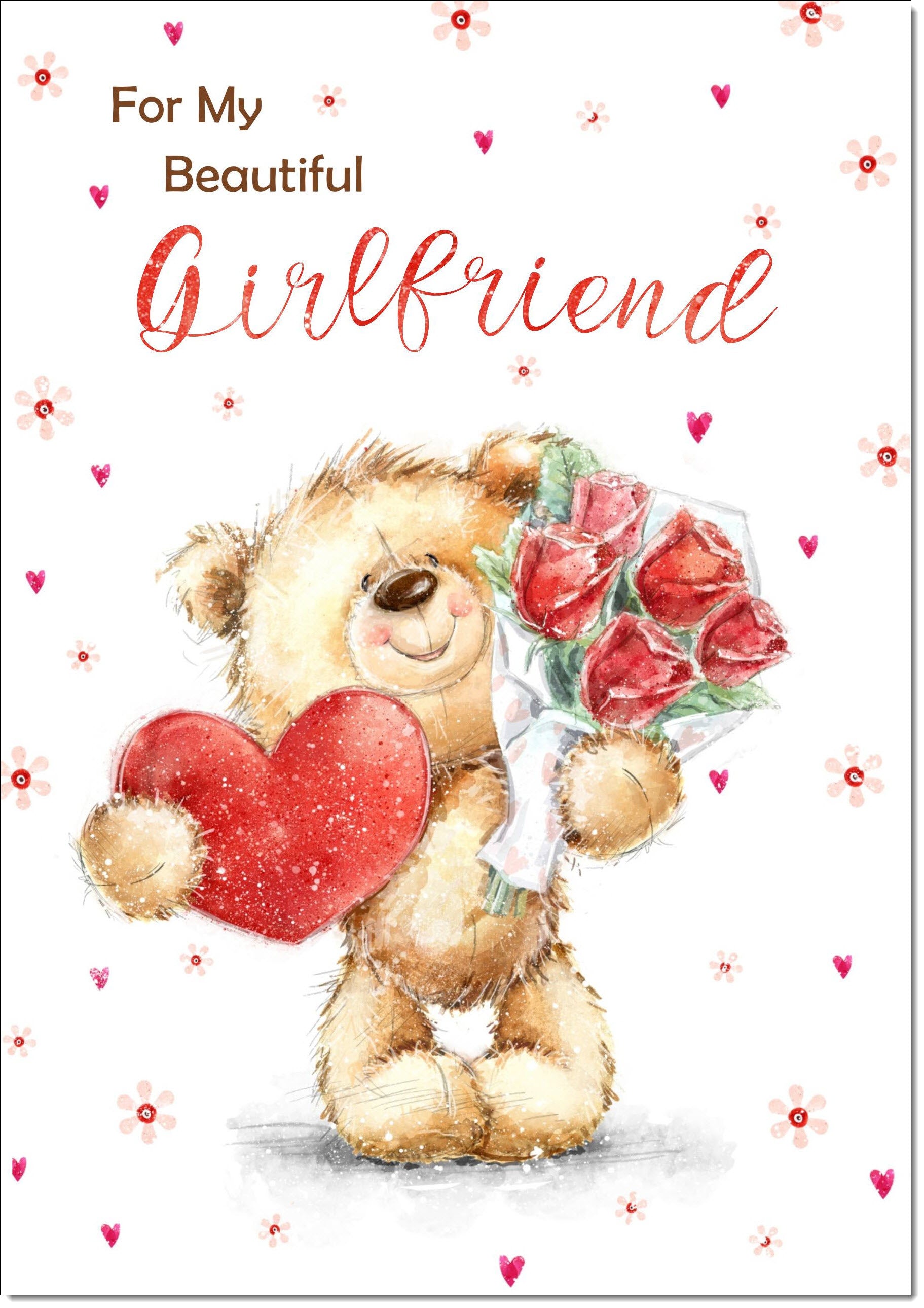 Girlfriend Birthday Card Teddy with Love Heart and Flowers