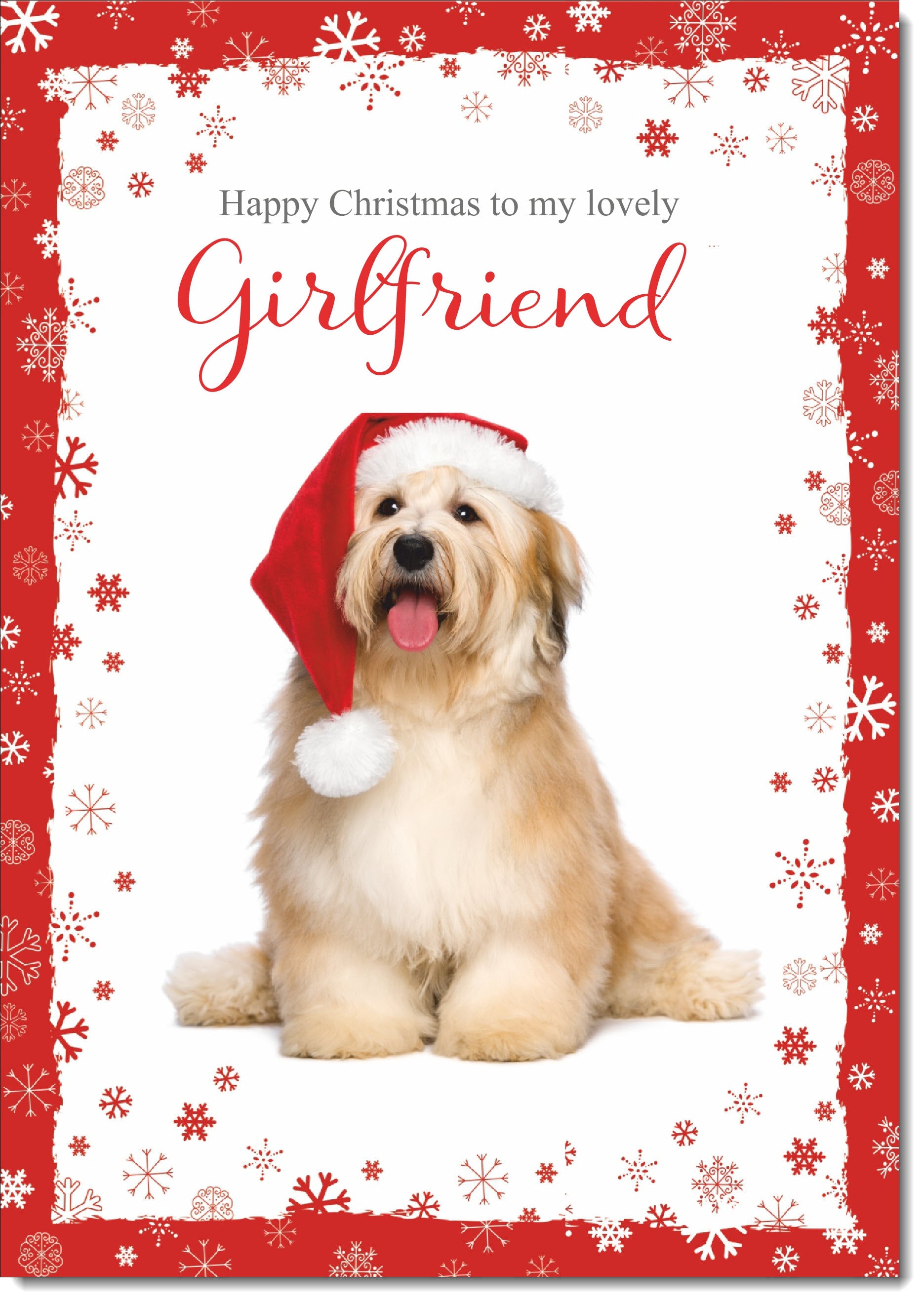 Girlfriend Christmas Card Fluffy Dog in Santa Hat
