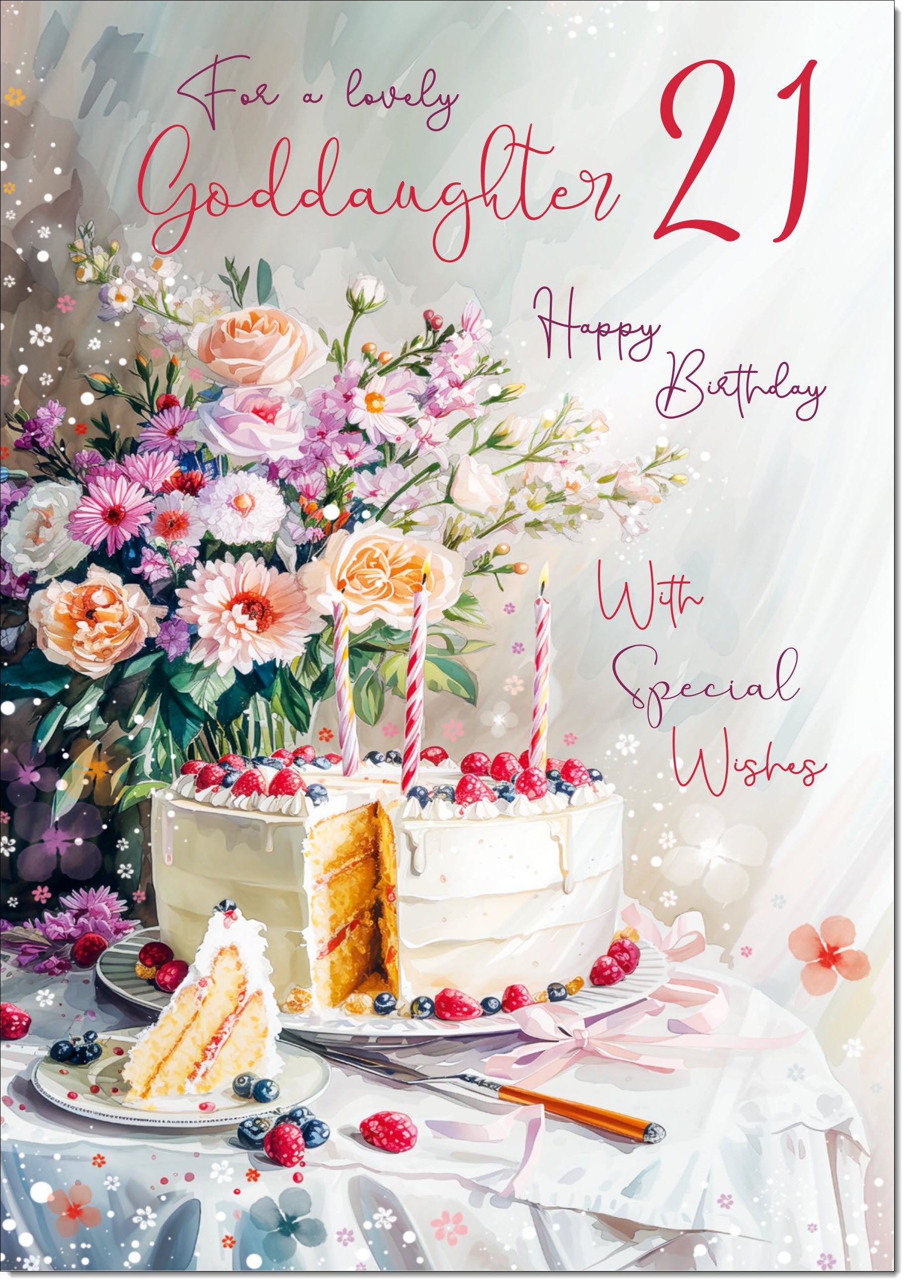Goddaughter 21st Birthday Card Age 21 Birthday Cake and Flowers