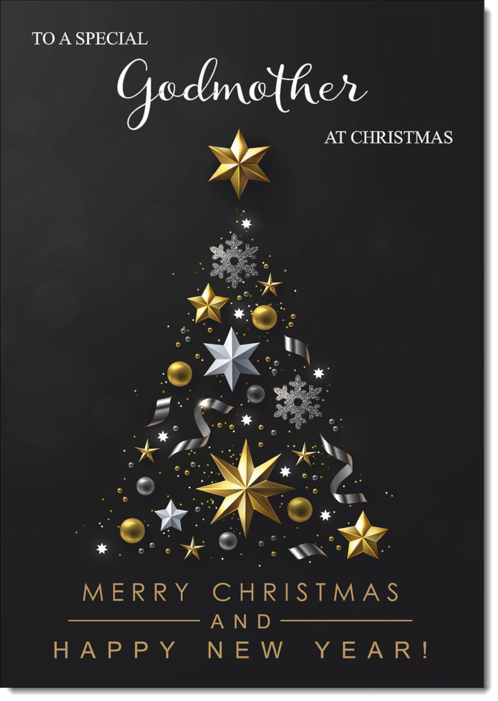 Godmother Christmas Card Black and Gold Abstract Tree