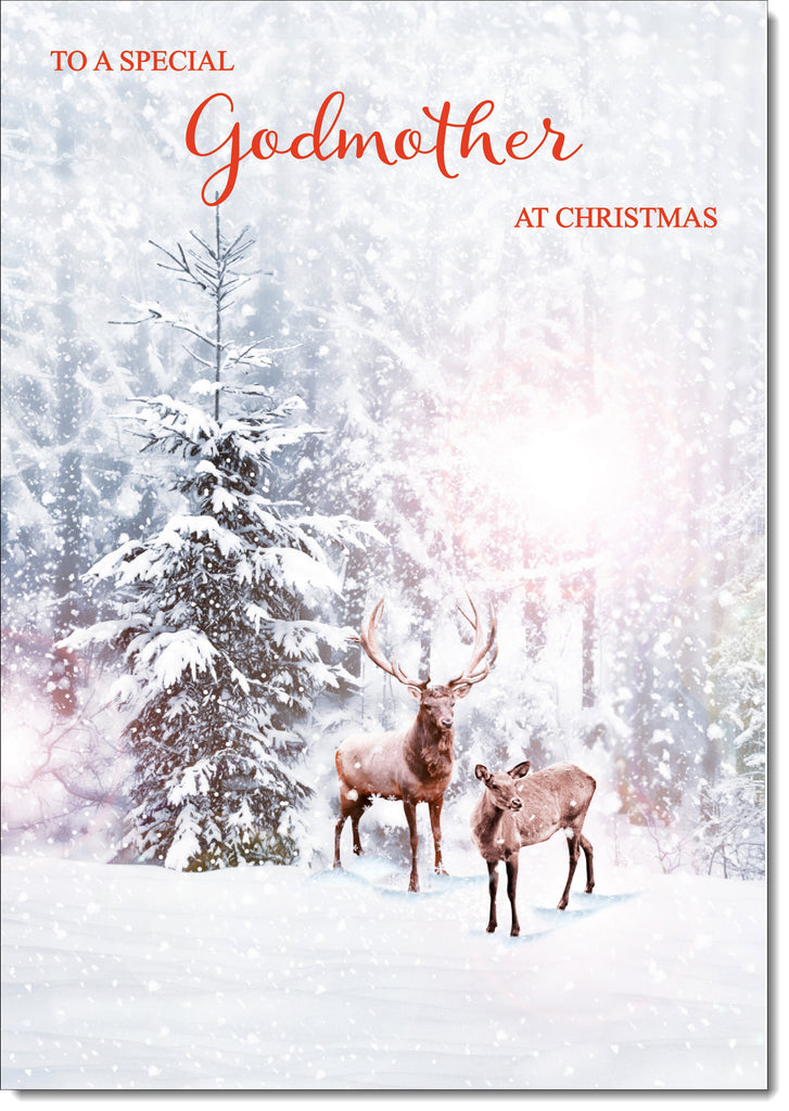 Godmother Christmas Card Stag and Doe in Snowy Forest