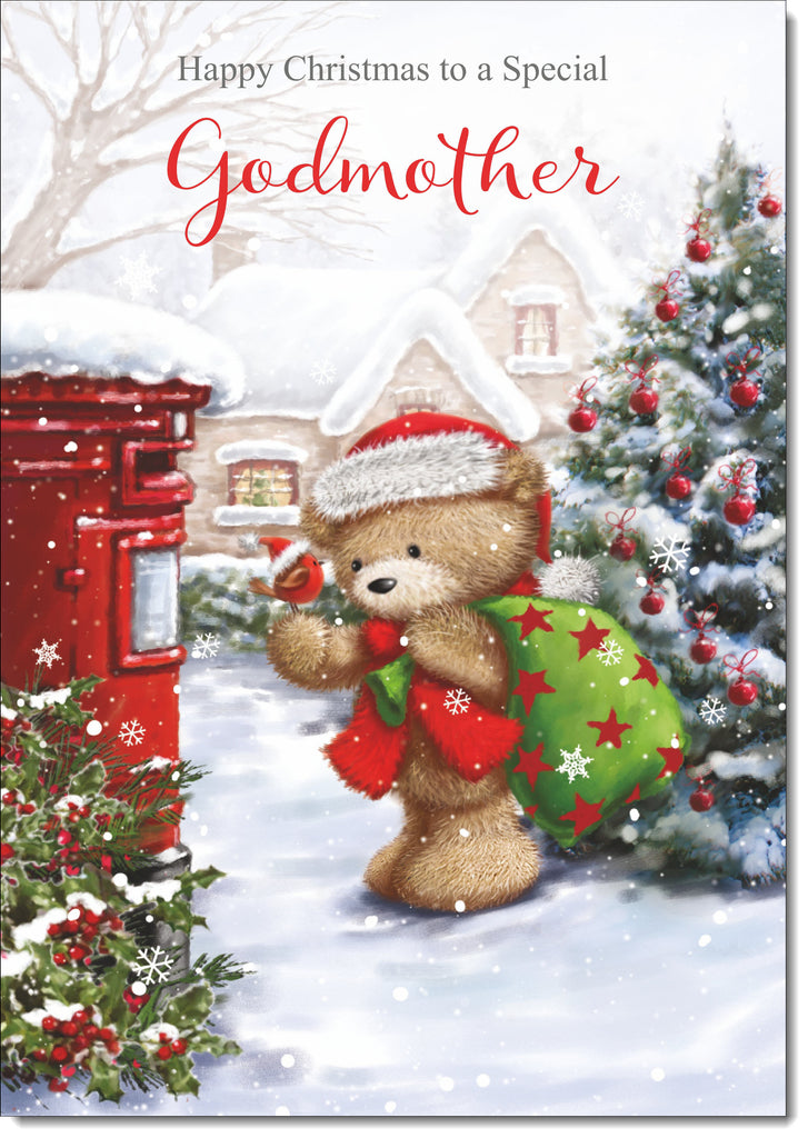 Godmother Christmas Card Cute Bear at Post Box