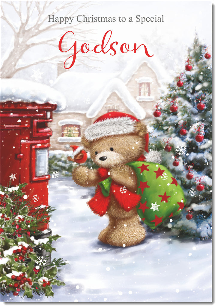 Godson Christmas Card Cute Bear at Post Box