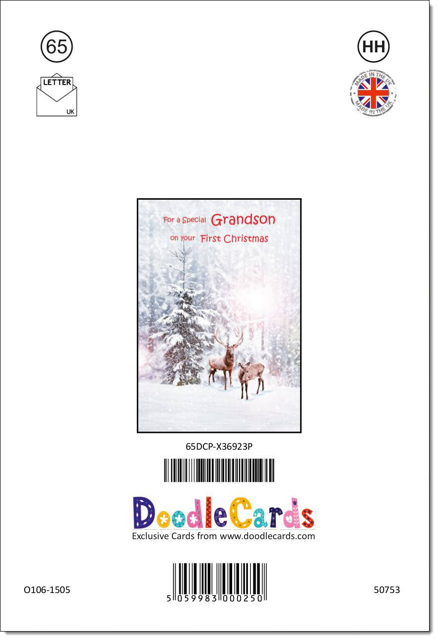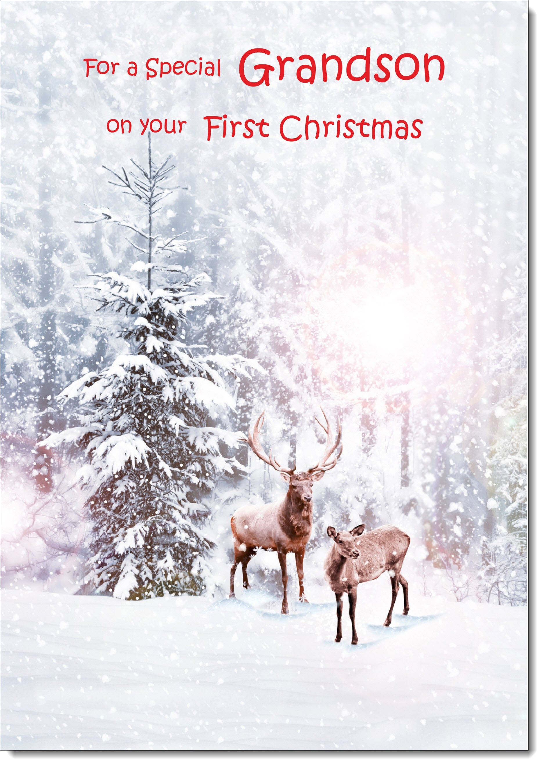 Grandsons 1st Christmas Card Stag and Doe in Snowy Forest