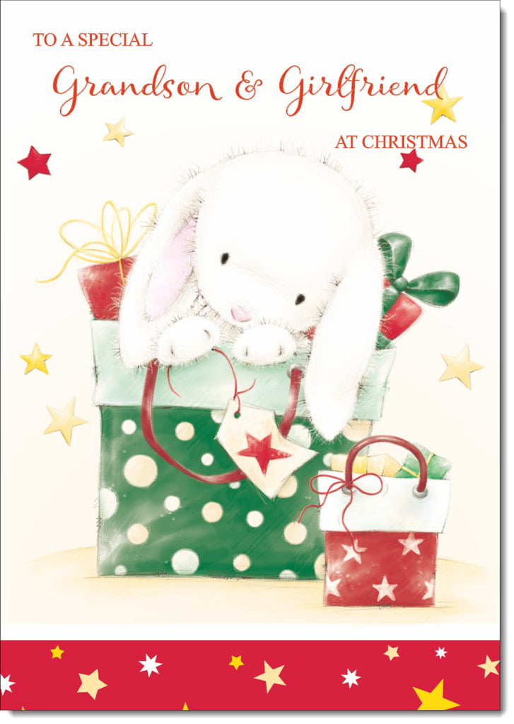 Grandson & Girlfriend Christmas Card Cute Rabbit with Parcels