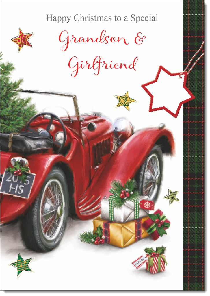 Grandson & Girlfriend Christmas Card Red Vintage Car
