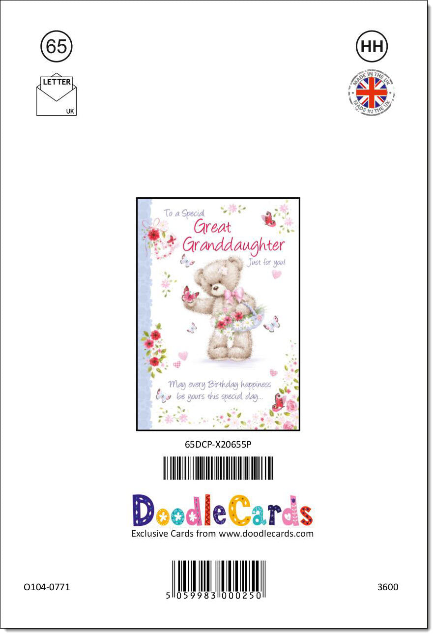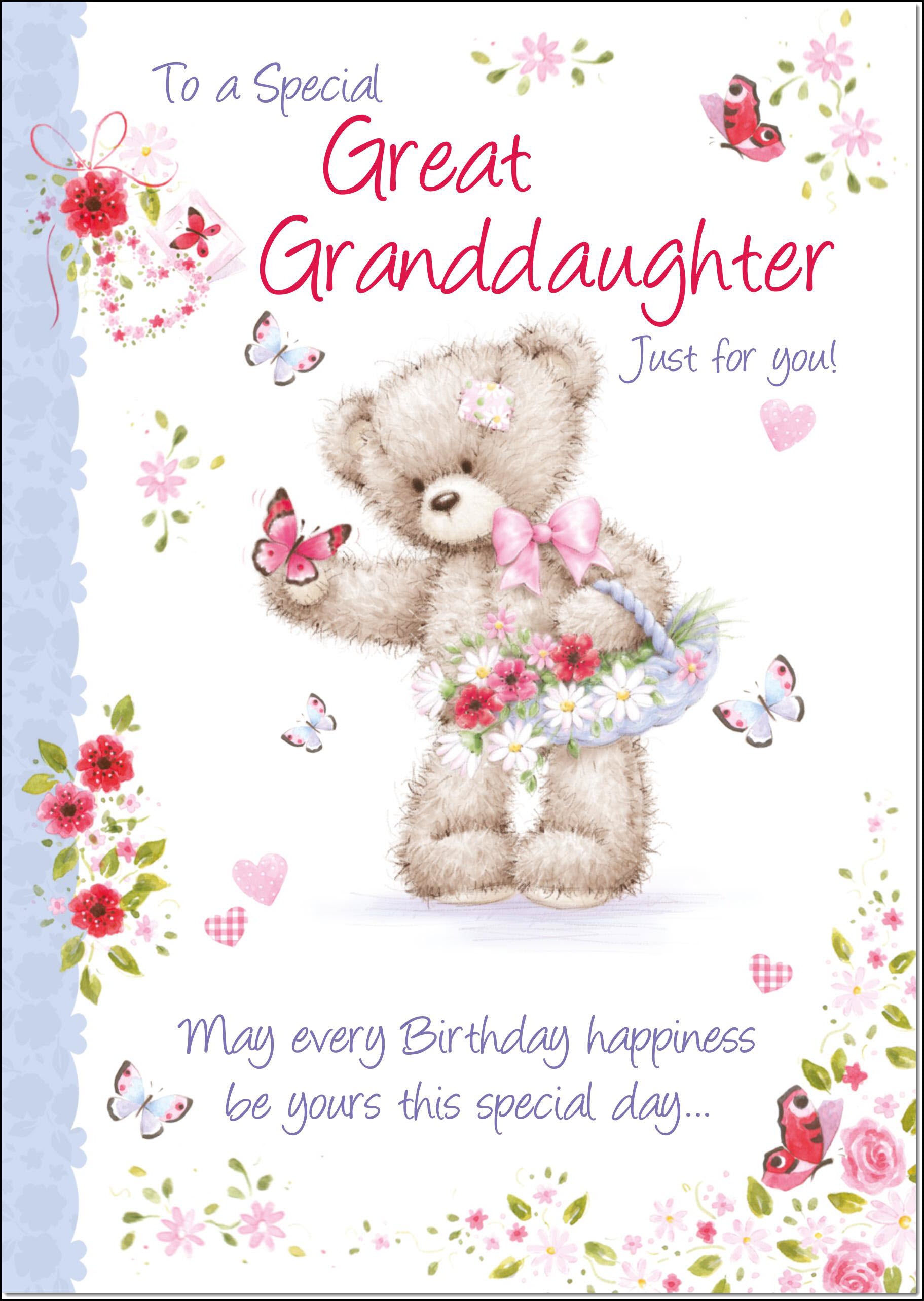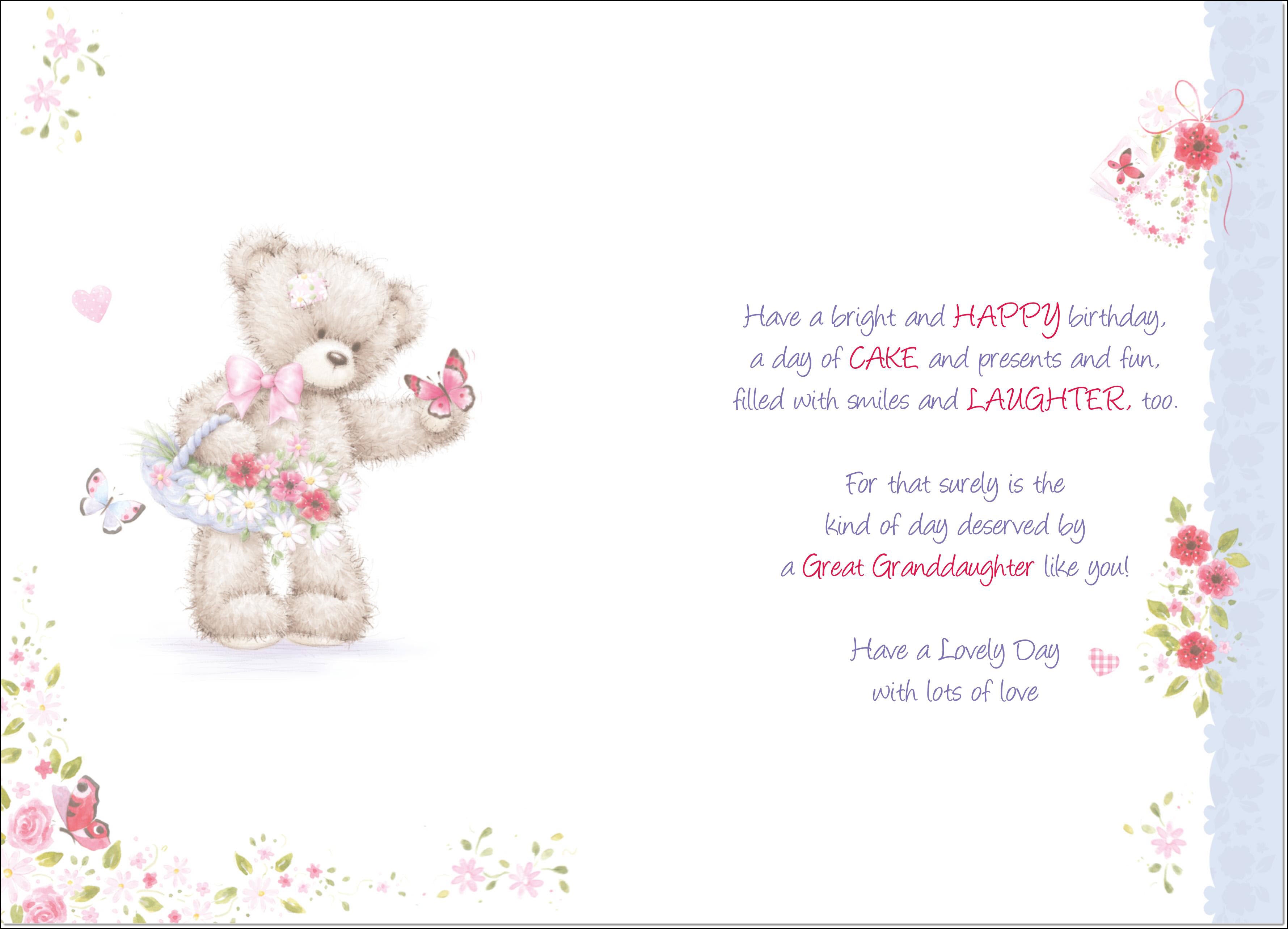 Great Granddaughter Birthday Card Cute Teddy's Flowers and Butterflies