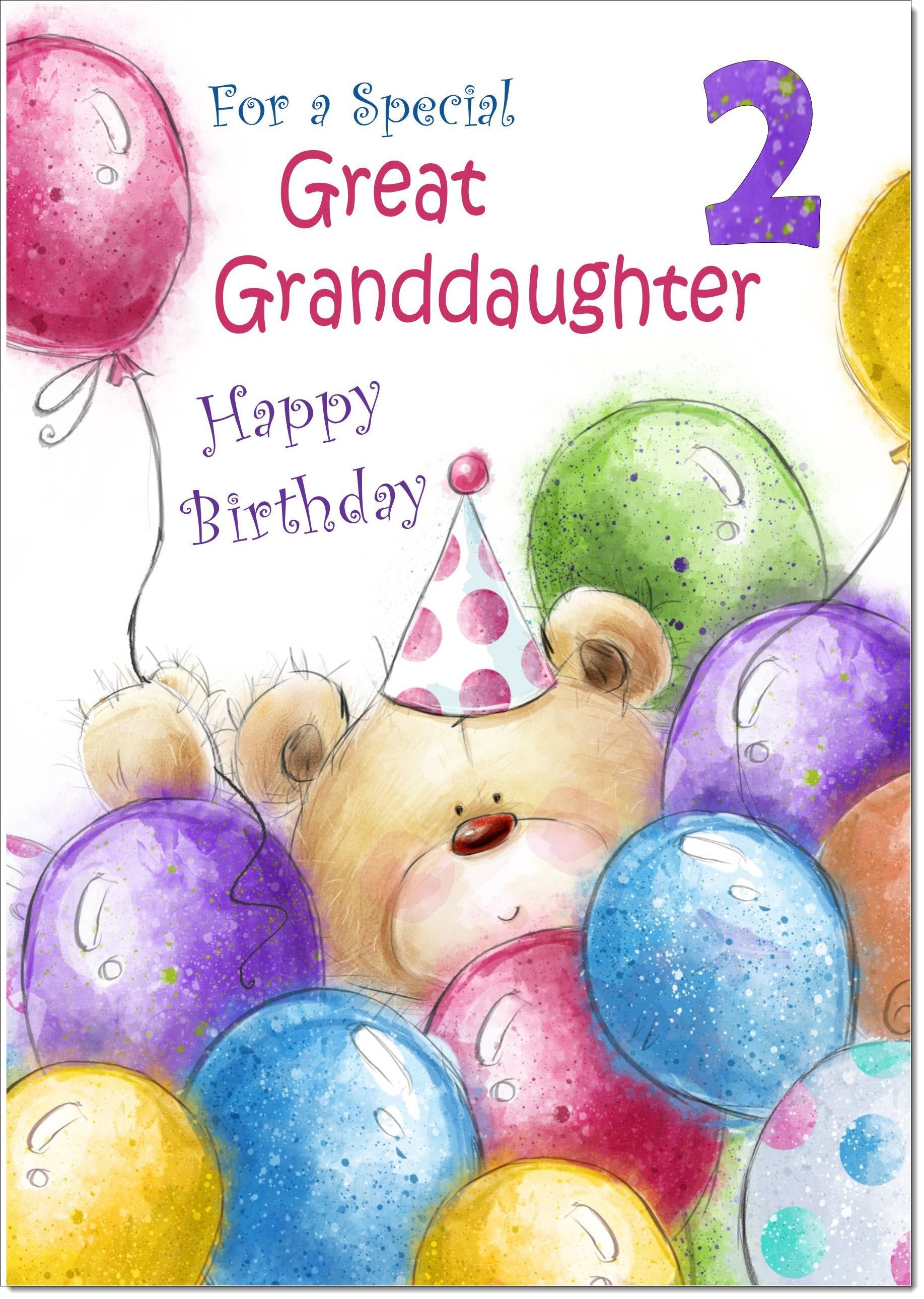 Great Granddaughter 2nd Birthday Card Age 2 Cute Teddy Bear in Balloons