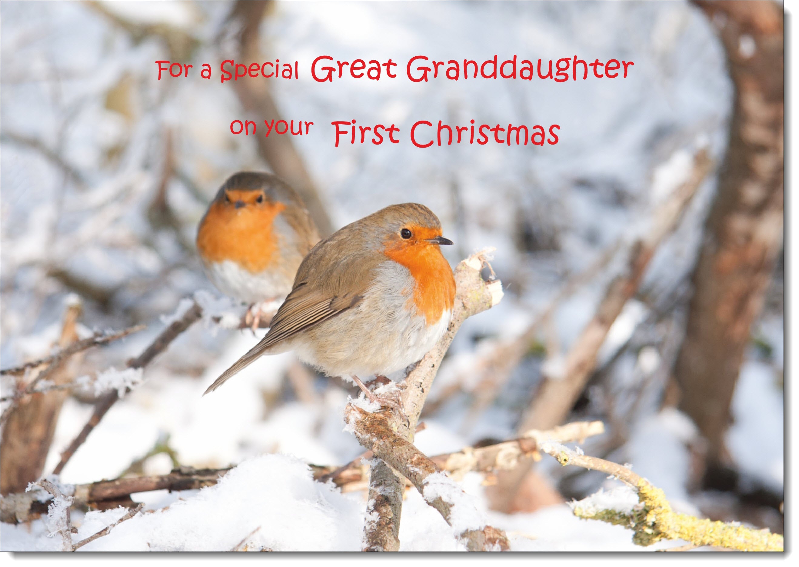 Great Granddaughters 1st Christmas Card Two Robins in Tree