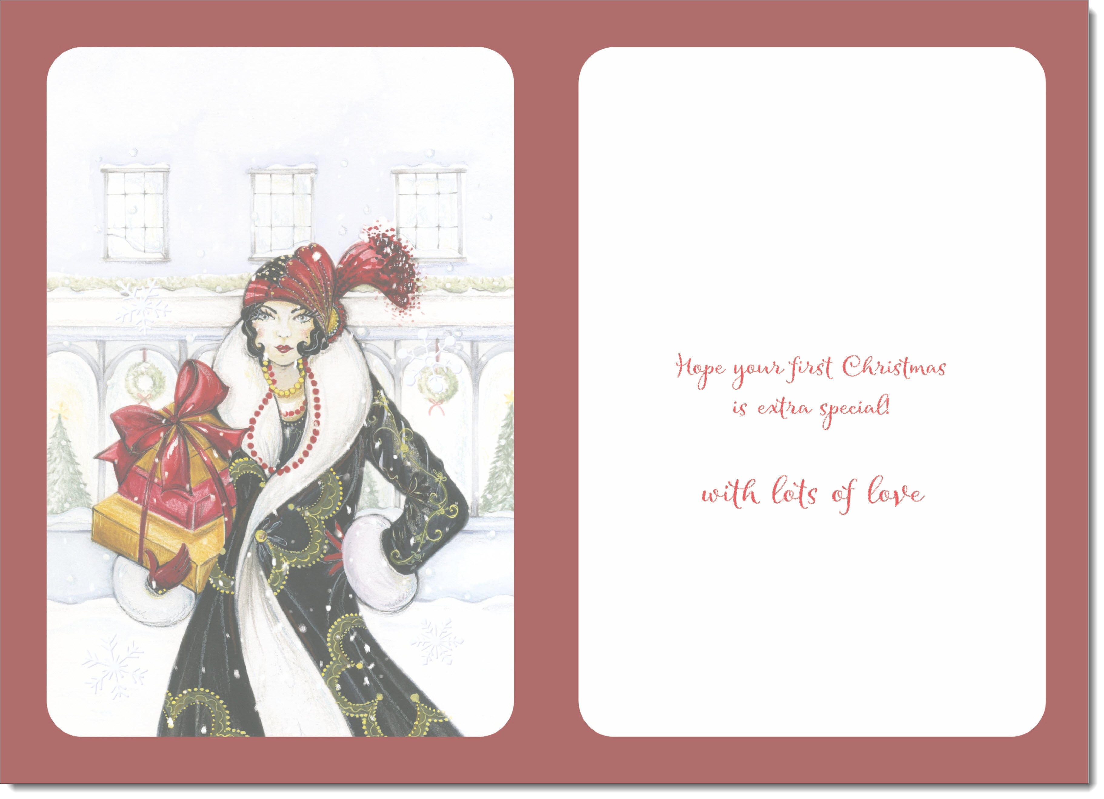 Great Granddaughters 1st Christmas Card Art Deco Lady with Christmas Gift