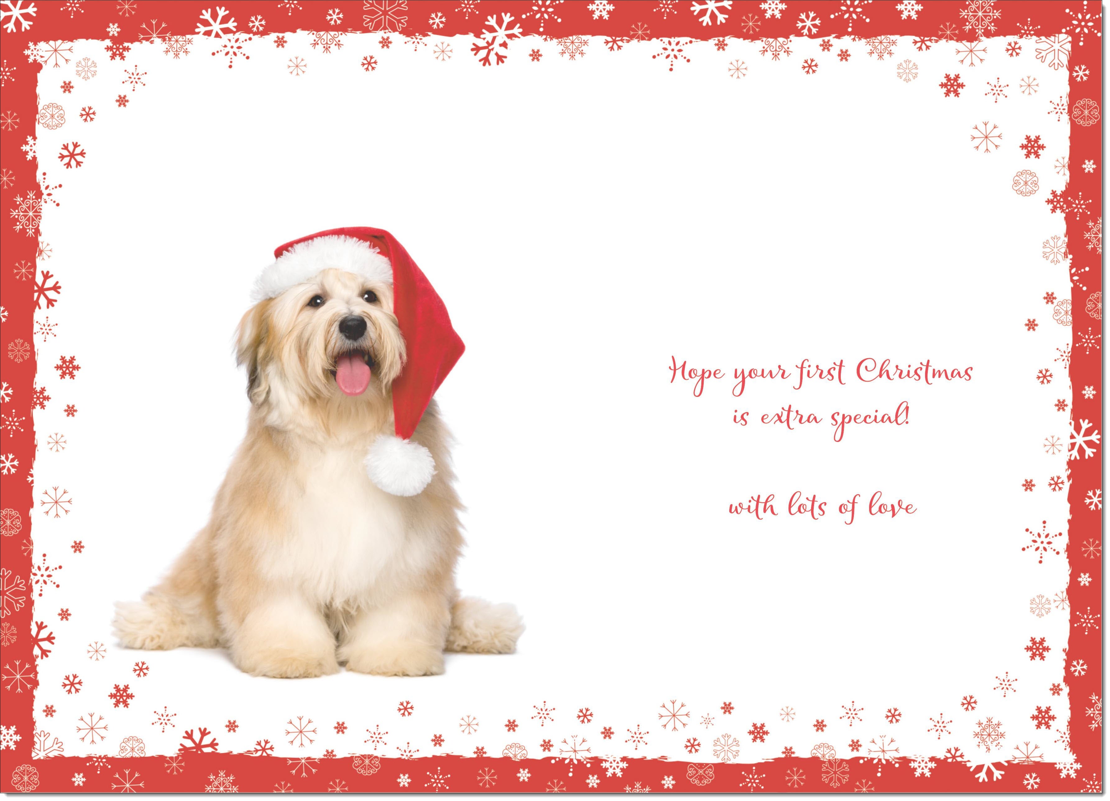 Great Granddaughters 1st Christmas Card Fluffy Dog in Santa Hat