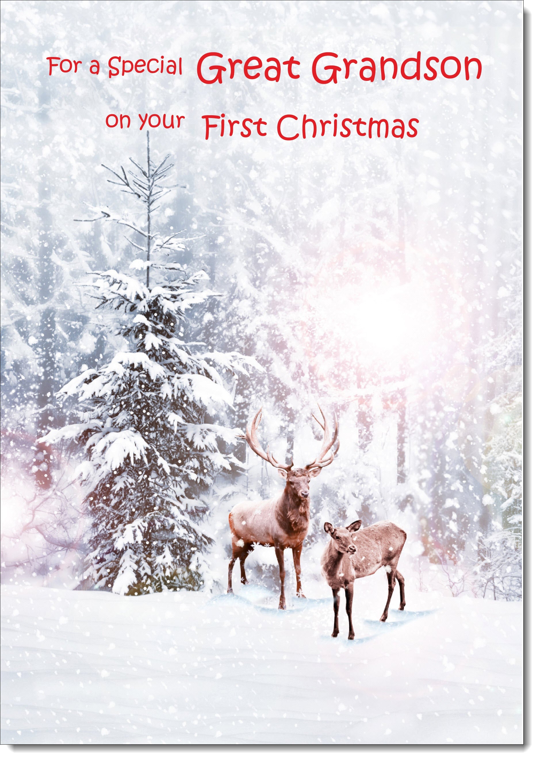 Great Grandsons 1st Christmas Card Stag and Doe in Snowy Forest