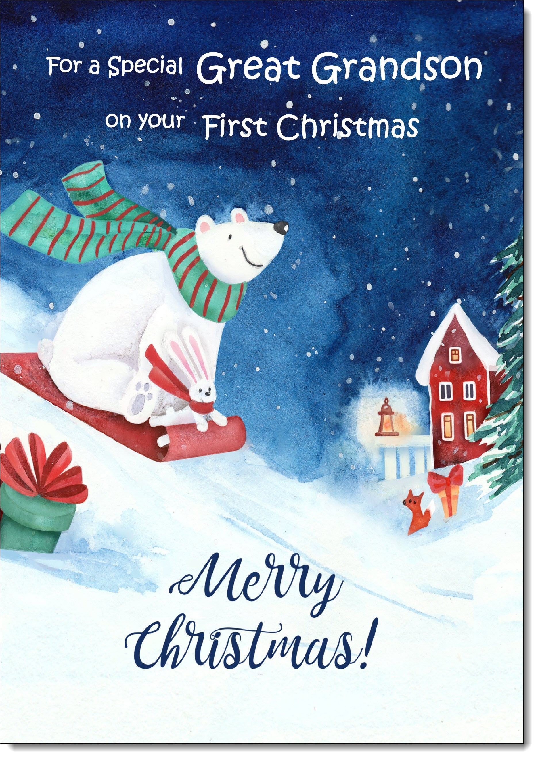 Great Grandsons 1st Christmas Card Polar Bear on Sled