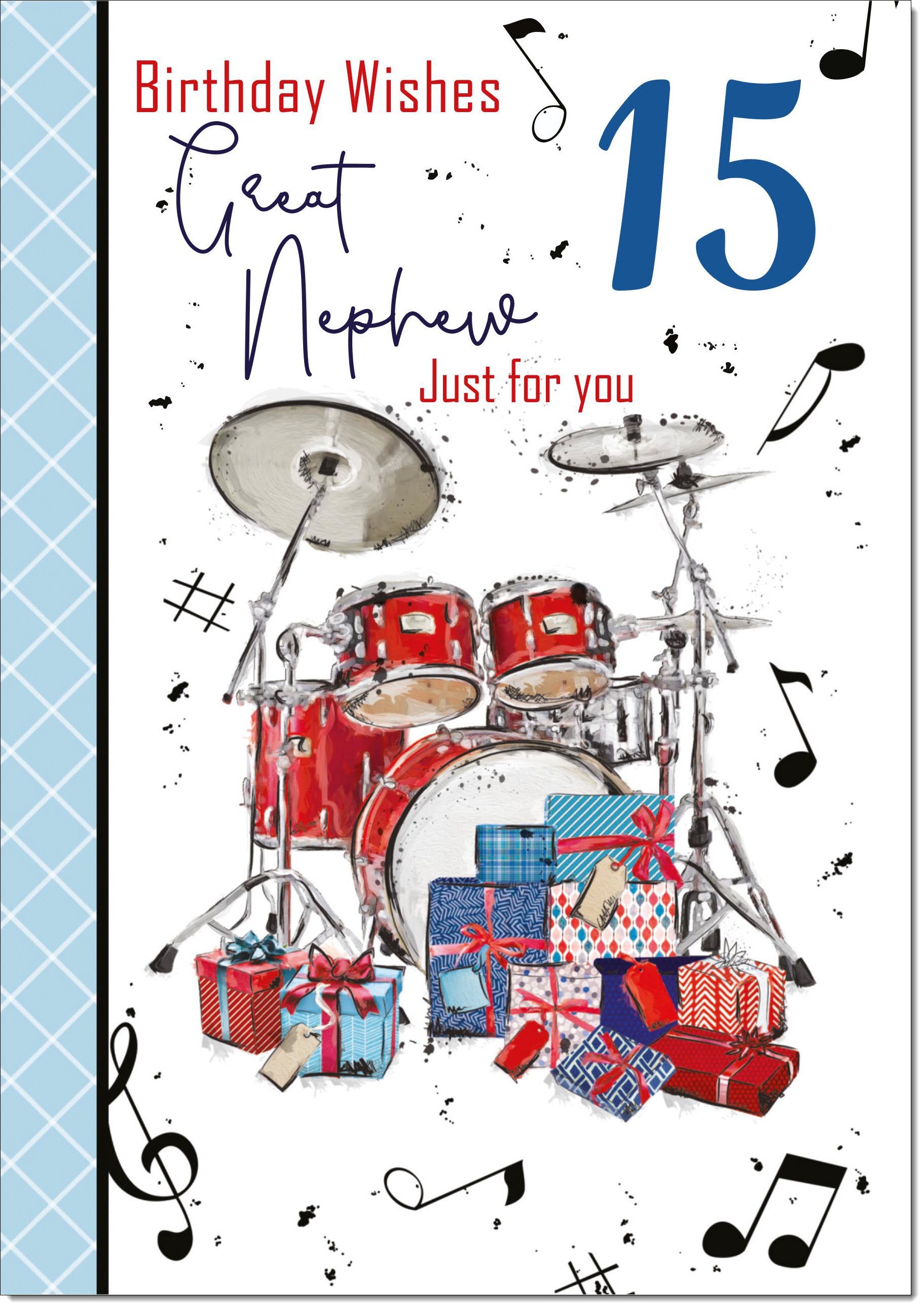 Great Nephew 15th Birthday Card Age 15 Drumkit